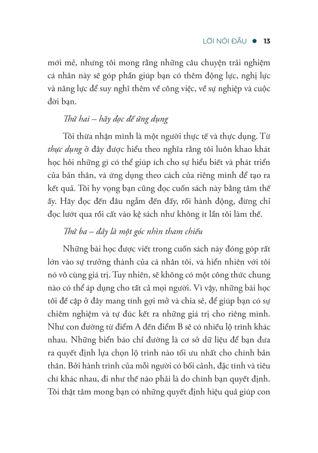 Mua tại TiktokHọc Chắc - Ngẫm Nhanh - Thành Sớm Phát triển sự nghiệp - ngẫu nhiên thành công hay chủ động nắm bắt A. TÓM TẮT SÁCH Cuốn sách "Học Chắc - Ngẫm Nhanh - Thành Sớm" là sự chia sẻ về hành trình phát triển sự nghiệp và bản thân của tác giả Nguyễn Minh Tuấn. Với cấu trúc 8 chương, tác giả truyền tải các bài học quý giá về việc học hỏi, suy ngẫm, và đạt được thành công sớm. Qua những trải nghiệm cá nhân, tác giả nhấn mạnh tầm quan trọng của việc học chắc – xây dựng nền tảng vững chắc, ngẫm nhanh – rút ra bài học từ thực tiễn, và từ đó đạt được thành công một cách chủ động. Nội dung không chỉ giới hạn ở lý thuyết mà còn đậm tính thực hành, giúp người đọc ứng dụng ngay vào công việc và cuộc sống, hướng tới phát triển bản thân và xây dựng sự nghiệp bền vững. B. GIÁ TRỊ CỦA CUỐN SÁCH Cung cấp phương pháp phát triển sự nghiệp sớm: Giúp người đọc có tư duy phát triển sự nghiệp hiệu quả từ sớm, tránh những sai lầm phổ biến khi bắt đầu đi làm. Thực tiễn và có tính ứng dụng cao: Các bài học từ sách có thể được áp dụng trực tiếp vào cuộc sống và công việc, không chỉ đơn thuần là lý thuyết. Xây dựng tự tin và tư duy phản biện: Tác giả nhấn mạnh sự quan trọng của việc xây dựng tự tin, tư duy phản biện để đạt được thành công. Khuyến khích phát triển mối quan hệ và thuyết phục: Giúp độc giả hiểu tầm quan trọng của việc xây dựng mạng lưới quan hệ và kỹ năng thuyết phục trong công việc. Hỗ trợ định hướng sự nghiệp cá nhân: Sách không chỉ giúp độc giả phát triển về chuyên môn mà còn hướng dẫn cách xây dựng sự nghiệp phù hợp với giá trị và mong muốn cá nhân. C. AI NÊN ĐỌC CUỐN SÁCH NÀY Người trẻ tuổi: Những người đang trong giai đoạn đầu phát triển sự nghiệp, muốn tìm kiếm phương pháp để học hỏi và phát triển bản thân. Người mới đi làm: Những ai đang gặp phải khó khăn và thử thách trong công việc, cần tìm kiếm động lực và phương pháp để nâng cao kỹ năng. Những người có khát vọng thành công: Các cá nhân đang mong muốn đạt được sự thành công sớm và hiệu quả trong sự nghiệp. Những nhà lãnh đạo trẻ: Những người muốn xây dựng phong cách lãnh đạo riêng và phát triển "chữ ký" cá nhân trong công việc. Người tự tìm cách phát triển bản thân: Những ai đang tìm kiếm phương pháp rèn luyện tư duy và tự cải thiện bản thân mỗi ngày, đặc biệt là trong môi trường công việc chuyên nghiệp. Sách dành cho người từ 18 đến 40 tuổi. C. CÁC TRÍCH ĐOẠN HAY “Tất cả những gì chúng ta làm hôm nay sẽ là bàn đạp, nền tảng cho ngày mai. Vậy tại sao chúng ta không kiến tạo một nền tảng tốt?” “Sự vận hành của cuộc sống là như thế, có khi thuận lợi cũng có lúc khó khăn. Trước những điều bất như ý, chúng ta thường có xu hướng lựa chọn những gì có tác dụng xoa dịu tức thì mà ít khi dành thì giờ để suy ngẫm về giá trị có được đằng sau những “cơn đau”. “Chẳng lẽ nếu gia nhập vào một công ty không nhiều điều kiện, thì bản thân sẽ dậm chân tại chỗ, không phát triển bản thân sao? Đó có vẻ không phải là tư duy hợp lý. Chúng ta hoàn toàn có quyền tự lựa chọn công cụ phù hợp với bản thân, hoặc cho dù không có công cụ đi chăng nữa, chúng ta vẫn luôn có thể tự chiêm nghiệm, tự tìm hiểu, khám phá và trải nghiệm, miễn là chúng ta chưa bao giờ tự đóng lại cánh cửa của chính mình.” GIỚI THIỆU TÁC GIẢ NGUYỄN MINH TUẤN Nguyễn Minh Tuấn là một chuyên gia Nhân sự với 15 năm kinh nghiệm dẫn dắt và phát triển tổ chức tại Đông Nam Á. Anh từng làm việc tại các công ty, tập đoàn danh tiếng trong nhiều lĩnh vực như Intel, Microsoft Việt Nam và Microsoft Nhật Bản, Avery Dennison, National Australia Bank. Với niềm đam mê phát triển con người và sự nghiệp, anh đầu tư nhiều thời gian và tâm sức cho việc học tập, nghiên cứu lĩnh vực này. Hiện tại, anh đã được chứng nhận và đang tích lũy nhiều kinh nghiệm trong vai trò Chuyên gia Khai vấn CliftonStrengths, CareerLeader và Hogan Assessments. Đây là những công cụ nổi bật và hiệu quả trong việc khám phá bản thân, phát triển nghề nghiệp đã được công nhận và ứng dụng rộng rãi trên thế giới.
