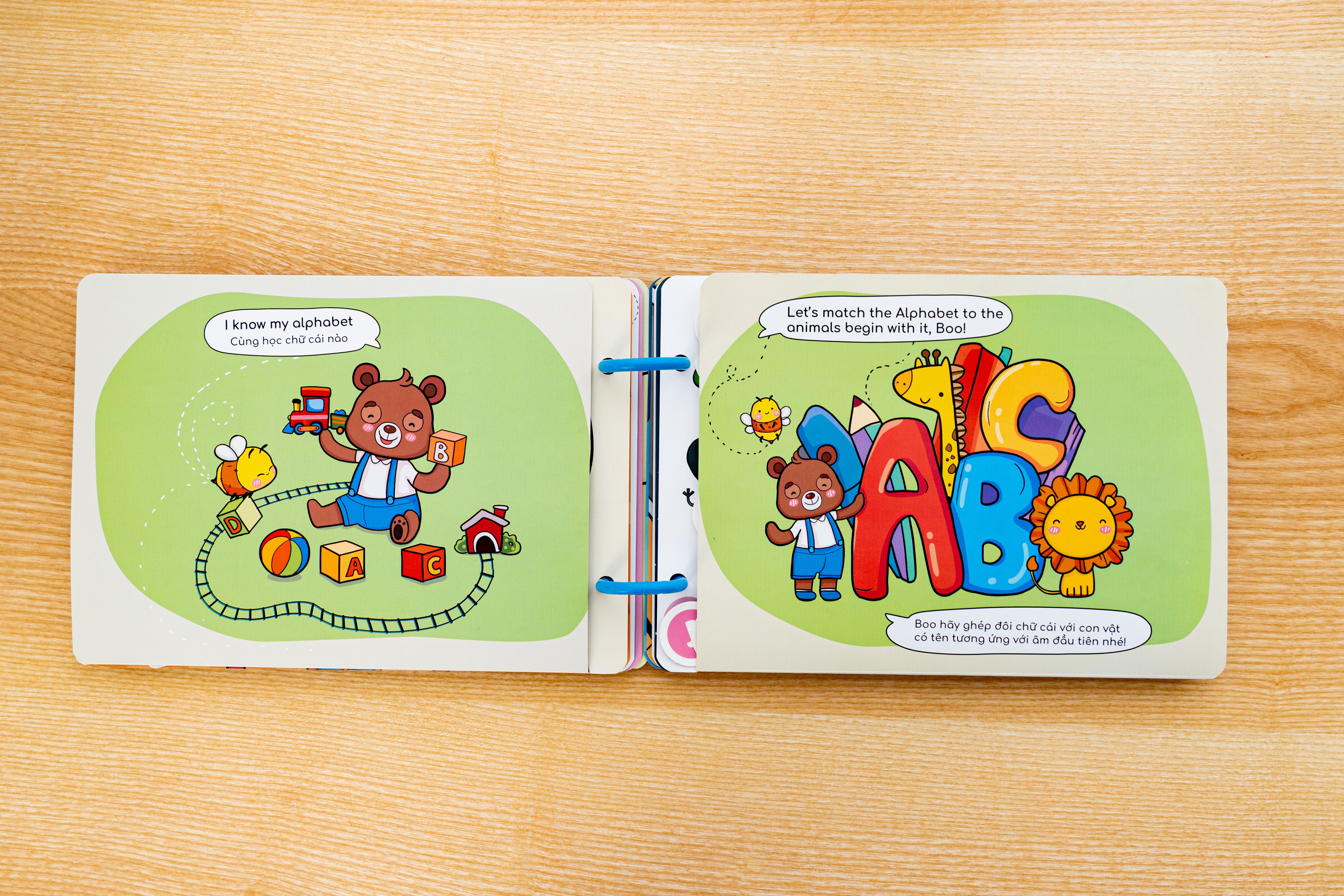- Song ngữ Anh Việt - Bé sẽ tiếp thu nhanh hơn thông qua việc nhìn mặt chữ và hình ảnh, các hành động bóc từ trang này, dán vào trang kia