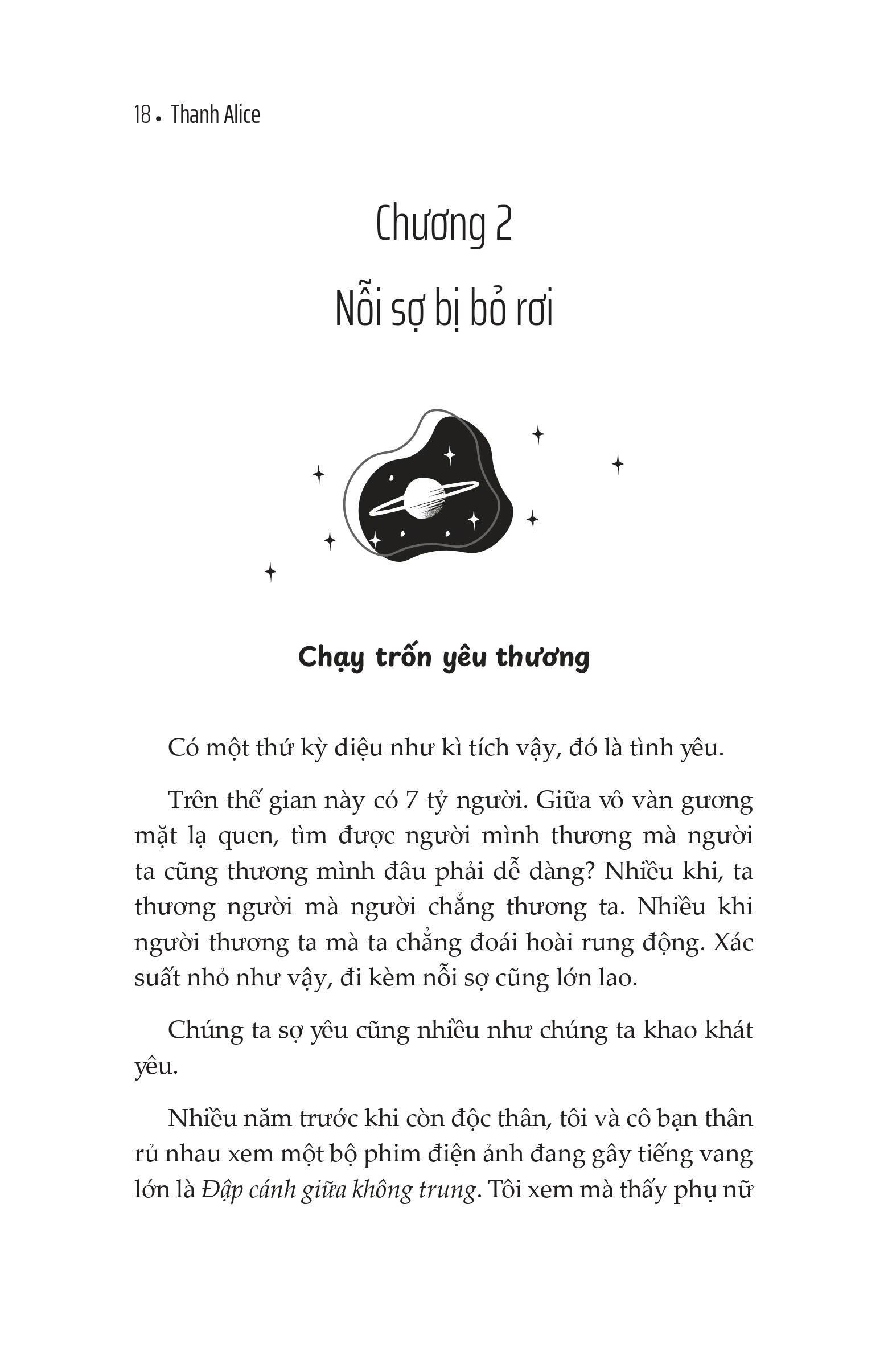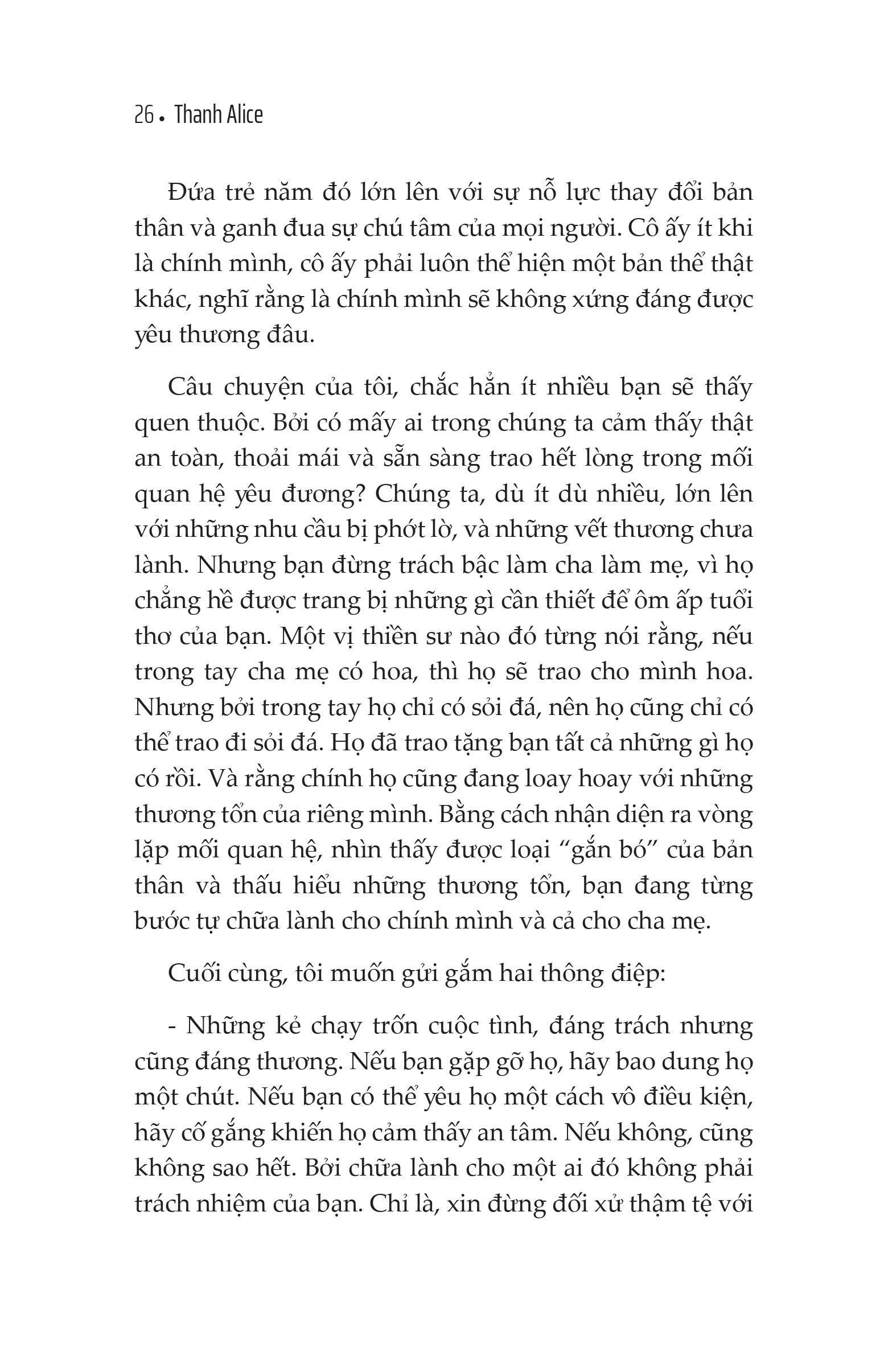 - Là một cô gái dịu dàng tin vào giá trị riêng biệt bên trong mỗi người. Giới thiệu tác phẩm: 1/5 giây để rung động với chính m.ình - Học thương m.ình giữa muôn vàn vụn vỡ Dành tặng bạn, người tự ti với nỗi lo không đủ tốt Cuốn sách tổng hợp 60 bài học chăm sóc sức khỏe tinh thần, giúp bạn thêm tin yêu bản thân Cùng bạn đi qua những vụn vỡ để tìm thấy dáng vẻ rực rỡ nhất của chính m.ình — NẾU CẦN 1/5 GIÂY ĐỂ RUNG ĐỘNG VỚI MỘT NGƯỜI, TÔI SẼ CHỌN CHÍNH MÌNH! “Chúng ta chỉ mất 1/5 giây để phải lòng 1 người. Người ta thường gọi đó là tình yêu sét đánh. Vậy tại sao chúng ta không thể dễ dàng yêu thương bản thân như cách chúng ta dễ dàng yêu một ai khác? Tại sao yêu thương bản thân lại cần nhiều điều kiện đến vậy? Sao ta không thể dành 1/5 giây để rung động với chính m.ình?” Bởi thế giới của người lớn là thế giới của định kiến, của quy chuẩn về đạo đức, giới tính, của những “nhãn mác” về thành công, hạnh phúc, của những tình yêu thương có điều kiện... Chúng ta đã lớn lên trong thế giới ấy với một trái tim đầy sợ hãi và nghi hoặc về chính m.ình. Những “vết thương”, những va vấp trên hành trình học cách trưởng thành khiến chúng ta dần tự ti, sợ rằng m.ình không đủ tốt, dần khép m.ình và chối bỏ những cảm xúc sâu thẳm bên trong. Thật ra, dù chúng ta có phớt lờ những gì m.ình cảm thấy mỗi khi tan vỡ, “đứa trẻ bên trong” ta vẫn luôn “thắt” lại, nhắc nhở rằng “đứa trẻ” ấy cũng cần được yêu thương và chữa lành. Thông qua 60 câu chuyện và bài tập thực hành nâng cao sức khỏe tinh thần trong cuốn sách “1/5 giây để rung động với chính m.ình?” - tác giả, thạc sĩ giáo dục Thanh Alice muốn nhắn nhủ tới bạn rằng:
