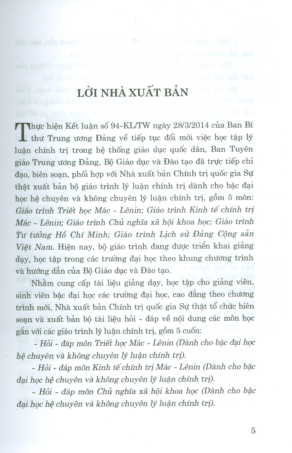 Bộ giáo trình lý luận chính trị gồm 5 cuốn dành cho bậc đại học hệ không chuyên lý luận chính trị. Bộ sách là tài liệu giảng dạy, học tập cho giảng viên, sinh