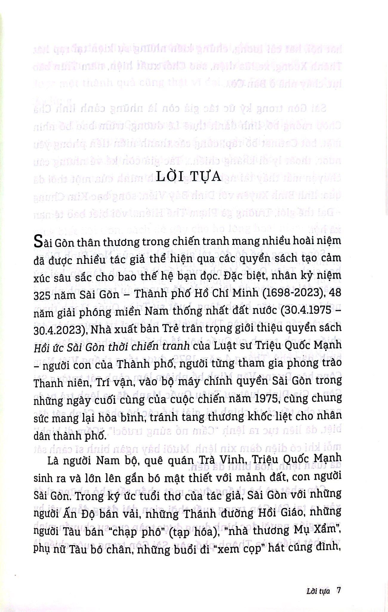 Sách Hồi ức Sài Gòn thời chiến tranh do Luật sư Triệu Quốc Mạnh - người sinh ra và lớn lên tại Sài Gòn, hoạt động trong phong trào đấu tranh phản chiến viết. Sài Gòn trong cuộc chiến qua hồi ức của tác giả là một tuyến đầu vĩ đại, một công sự vĩ đại, đồng bào nơi đây vừa đấu tranh vừa đùm boc, vừa xây dựng để cuối cùng có được một thành quả cũng thật sự vĩ đại, một Sài Gòn tuyệt đẹp, lẫy lừng.