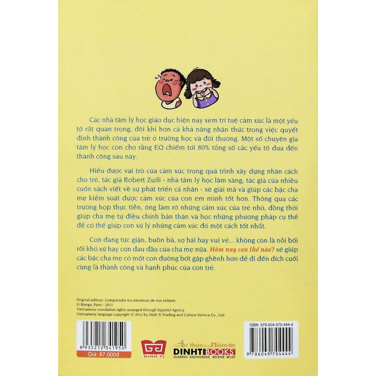 Cuốn sách của Robert Zuili – nhà tâm lý học lâm sàng nổi tiếng sẽ giúp cha mẹ: Thấu hiểu cảm xúc của con: giận dữ, buồn bã, lo lắng hay hạnh phúc. Biết cách quan sát và nhận diện thay vì ép buộc con phải nói. Học phương pháp cụ thể để đồng hành cùng con, giúp con xử lý cảm xúc tích cực hơn. Tự điều chỉnh cảm xúc bản thân, trở thành chỗ dựa an toàn cho con.