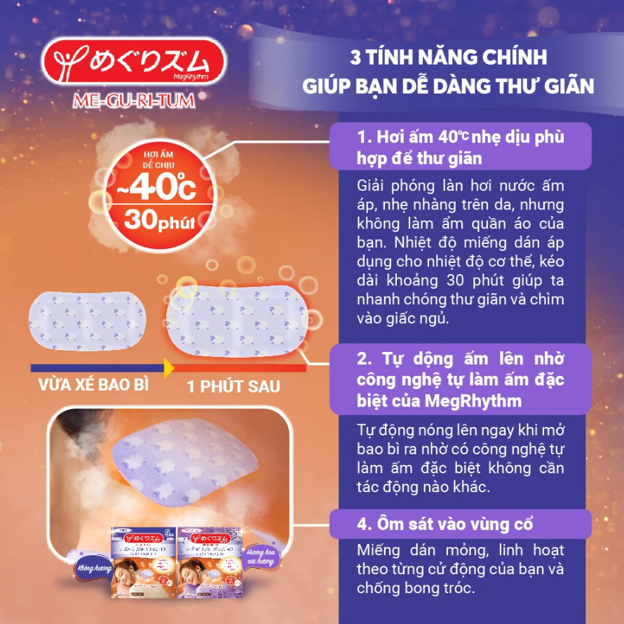 • Sản phẩm giúp loại bỏ căng cơ, thư giản vùng cơ nơi cổ, vai. Sau khi bóc ra nhiệt độ tăng liền lên khoảng 40 độ C, có tác dụng nhiệt trong khoảng 30 phút, thích hợp dùng buổi đêm
