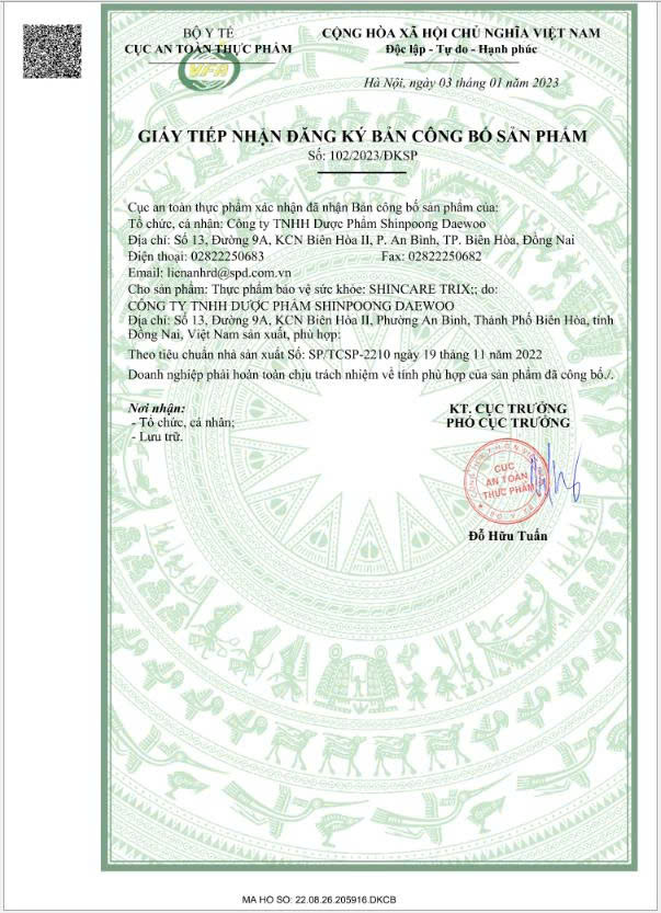 THỰC PHẨM BẢO VỆ SỨC KHỎE: SHINCARE TRIX THÀNH PHẦN Mỗi viên nén bao phim (780 mg) chứa: Diosmin ...200 mg Chiết xuất hạt Dẻ Ngựa (Horse chestnut Extract) ....100 mg (tương đương Aescin 20