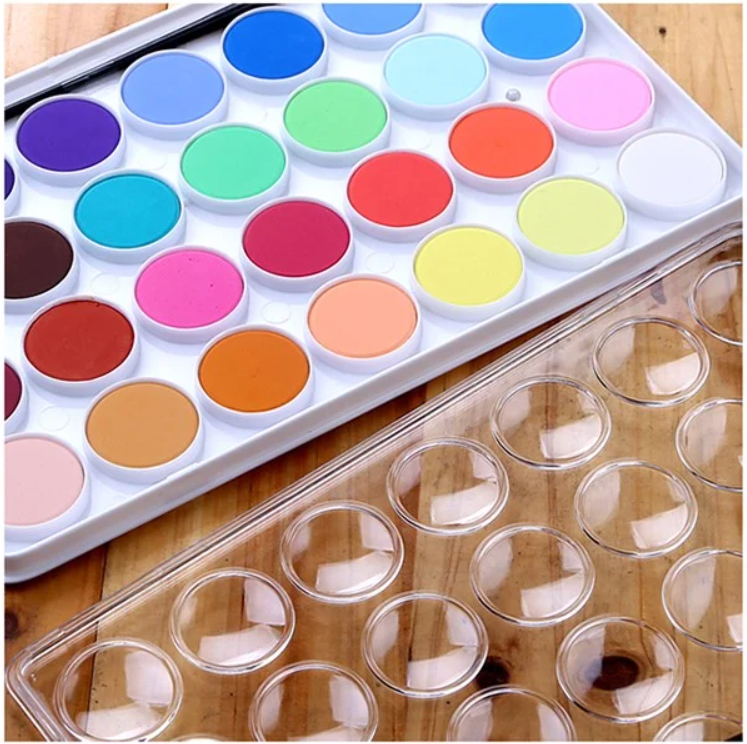 Bánh màu được đóng trong khay chữ nhật trong suốt gọn gàng cùng kèm theo cọ và khay đựng cọ giúp bạn dễ dàng mang màu theo