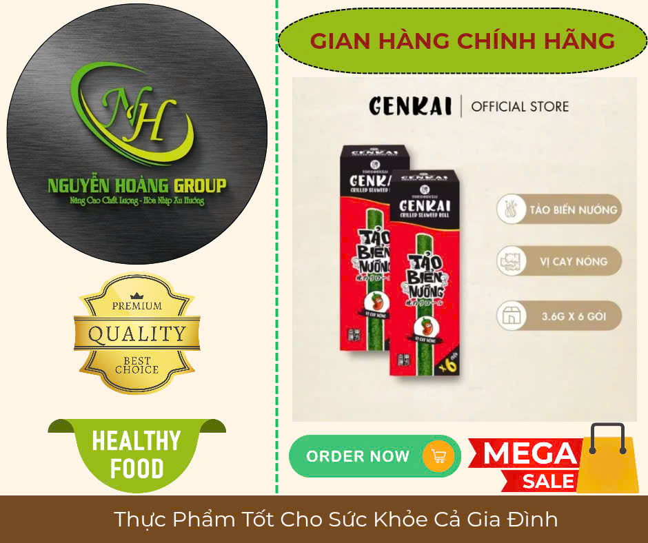 Tên sản phẩm: RONG BIỂN NƯỚNG CUỘN Có 2 Vị : Tự Nhiên & Vị Cay NÓNG Thành phần: Rong biển 68%, dầu ngô 26.7%, dầu mè 4.3%, muối biển 1% Lá Rong biển có