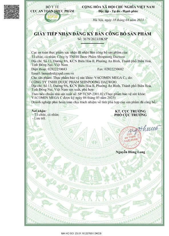 Đặt cam kết: “Vì sức khỏe mọi người” vào từng sản phẩm, Shinpoong Pharma không ngừng nỗ lực tạo nên những giải pháp toàn diện về sức khỏe dựa trên gần 63 năm nghiên cứu khoa học, thành tựu về công nghệ và nguyên liệu chất lượng nhập khẩu, tuyển chọn từ các chuyên gia hàng đầu tại Hàn Quốc và Việt Nam. THỰC PHẨM BẢO VỆ SỨC KHỎE | VACOMIN MEGA C - Hỗ trợ nâng cao đề kháng, bổ sung năng lượng, hấp thu sắt và làm đẹp da THÀNH PHẦN: Mỗi viên nén bao phim (1300mg) chứa: Vitamin C (L-ascorbic acid)   CÔNG DỤNG: Hỗ trợ nâng cao đề kháng Bổ sung năng lượng Tăng hấp thu sắt Tăng sinh collagen, làm đẹp da   ĐỐI TƯỢNG SỬ DỤNG: CÁCH DÙNG: 1 viên/ ngày sau khi ăn sáng hoặc ăn trưa QUY CÁCH ĐÓNG GÓI: Hộp 6 vỉ x 10 viên. BẢO QUẢN: Trong bao bì kín, ở nơi khô, tránh ánh sáng, nhiệt độ dưới 30ºC. HSD: 36 tháng kể từ ngày sản xuất. LƯU Ý: Thực phẩm này không phải là thuốc và không có tác dụng thay thế thuốc chữa bệnh. Không dùng sản phẩm này nếu bạn dị ứng/ mẫn cảm với thành phần của sản phẩm. Tham khảo ý kiến bác sĩ nếu bạn đang dùng thuốc khác. Để xa tầm tay trẻ em.