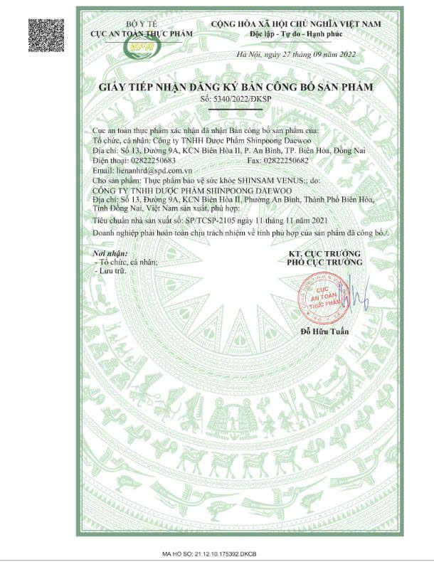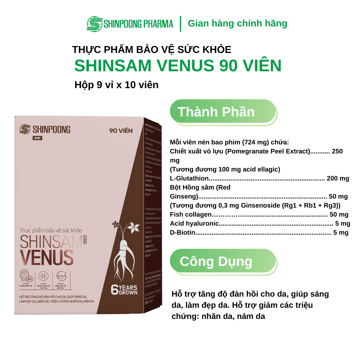Mua tại TiktokTHỰC PHẨM BẢO VỆ SỨC KHỎE SHINSAM VENUS THÀNH PHẦN Mỗi viên nén bao phim (724 mg) chứa: Chiết xuất vỏ lựu (Pomegranate Peel Extract) 250 mg (Tương đương 100 mg acid ellagic) L-G 200 mg Bột Hồng sâm (Red Ginseng) 50 mg (Tương đương 0,3 mg Ginsenoside (Rg1 + Rb1 + Rg3)) Fish collagen…………… 50 mg Acid 5 mg D-B 5 mg QUY CÁCH ĐÓNG GÓI Hộp 9 vỉ x 10 viên. CÔNG DỤNG Hỗ trợ tăng độ đàn hồi cho da, giúp sáng da, làm đẹp da. Hỗ trợ giảm nhăn da, nám da. ĐỐI TƯỢNG SỬ DỤNG