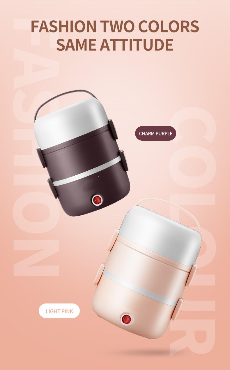 Hộp cơm giữ nhiệt hâm nóng bằng điện qua cổng sạc. Chất liệu vỏ nhựa, ruột inox 304, 3 tầng.