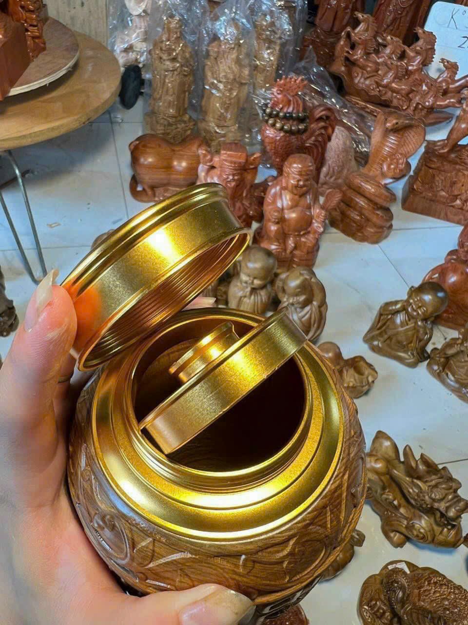 _ Hộp trà được chạm khắc nhiều hoa văn khác nhau ,nếu khách muốn được mẫu khắc tích gì ,hay để trơn cứ nhắn tin để nhà bán gửi tới chính xác mẫu muốn được .Hộp đựng trà được chế tác và hoàn thiện do bàn tay khối óc tài hoa .Từ những người thợ giàu kinh nghiệm cũng như tay nghề cao trong làng nghề truyền thống .