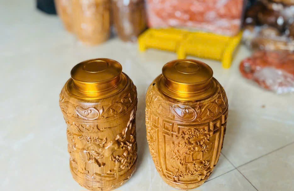 _ Hộp đựng trà chè được làm bằng chất liệu gỗ bách xanh thơm nức liền khối tự nhiên 100% _ Kt cao 20 thân tròn 12cm _ Hộp được khắc nổi tỉ mỉ ,tinh