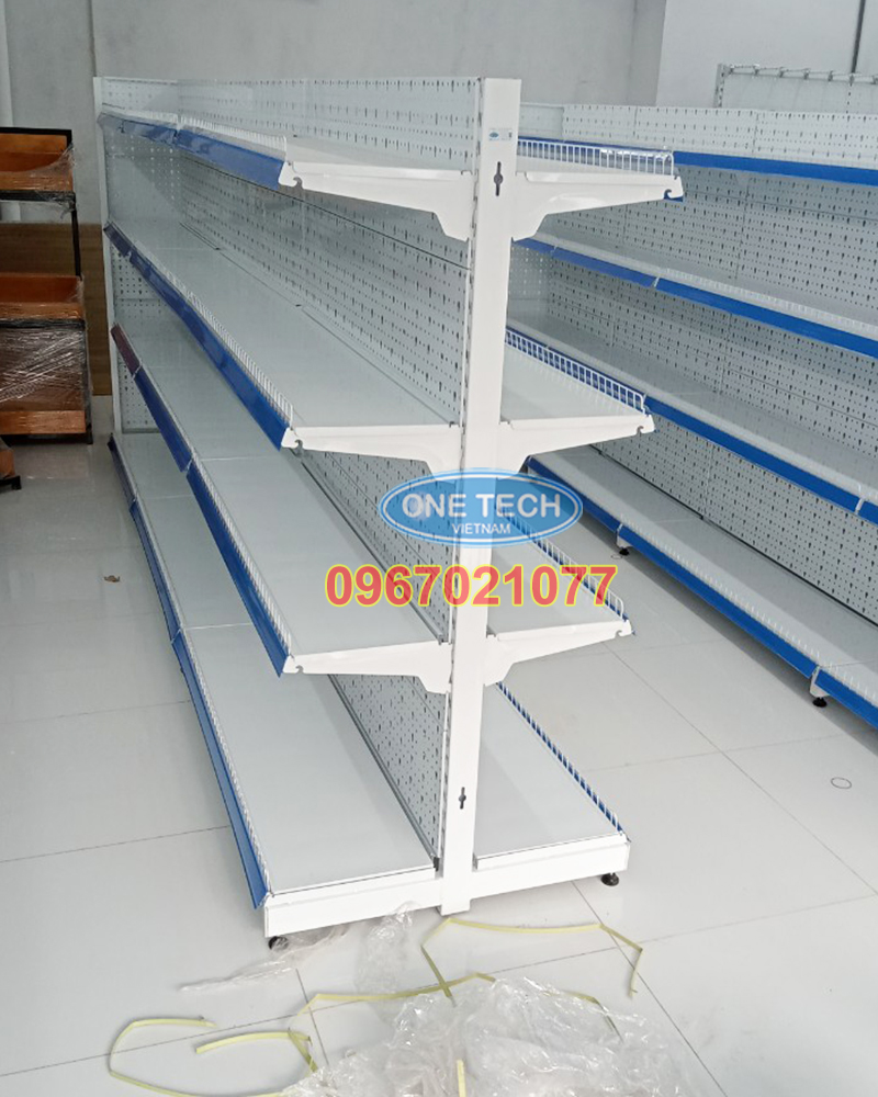 Mẫu kệ siêu thị đôi tôn đục lỗ C1500 x D900 x R750 x 4 tầng có chức năng bày bán sản phẩm trong siêu thị và cửa hàng. Kệ có độ bền cao, sử dụng trên 10 năm và phù hợp với hầu hết các mặt bằng siêu thị lớn nhỏ.