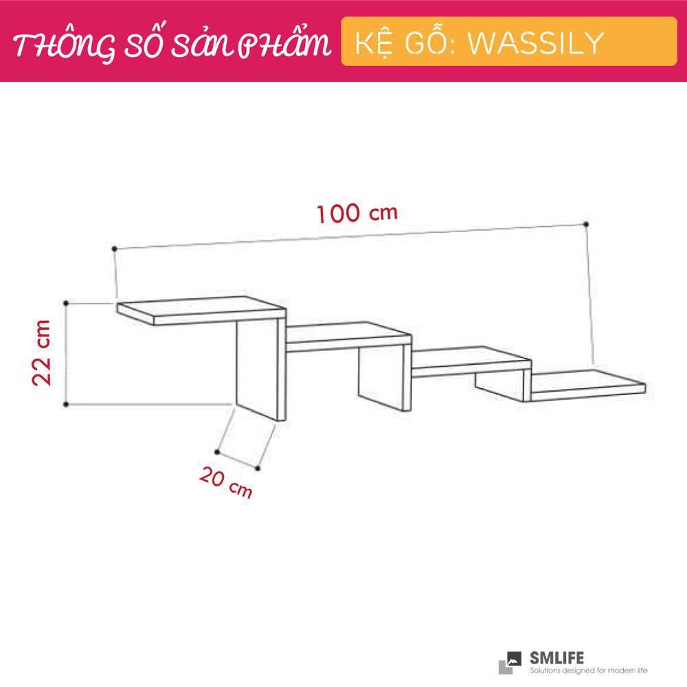 Mua tại TiktokMang đậm phong cách nội thất đơn giản, kệ gỗ trang trí gắn tường hiện đại SMLIFE Wassily là một sự bổ sung hoàn hảo cho căn hộ hay văn phòng của bạn. Kệ gỗ Wassily được thiết kế theo phong cách đơn giản, hiện đại giúp bạn thoải mái trang trí sách hay các vật dụng trang trí an toàn. Sử dụng vật liệu ván ép công nghiệp MDF chống ẩm phủ Melamine cao cấp giúp kệ gỗ trang trí SMLIFE có độ bền cao, chống trầy và chống ẩm rất tốt. Bạn có thể tự lắp đặt sản phẩm dễ dàng với các phụ kiện và hướng dẫn đi kèm.