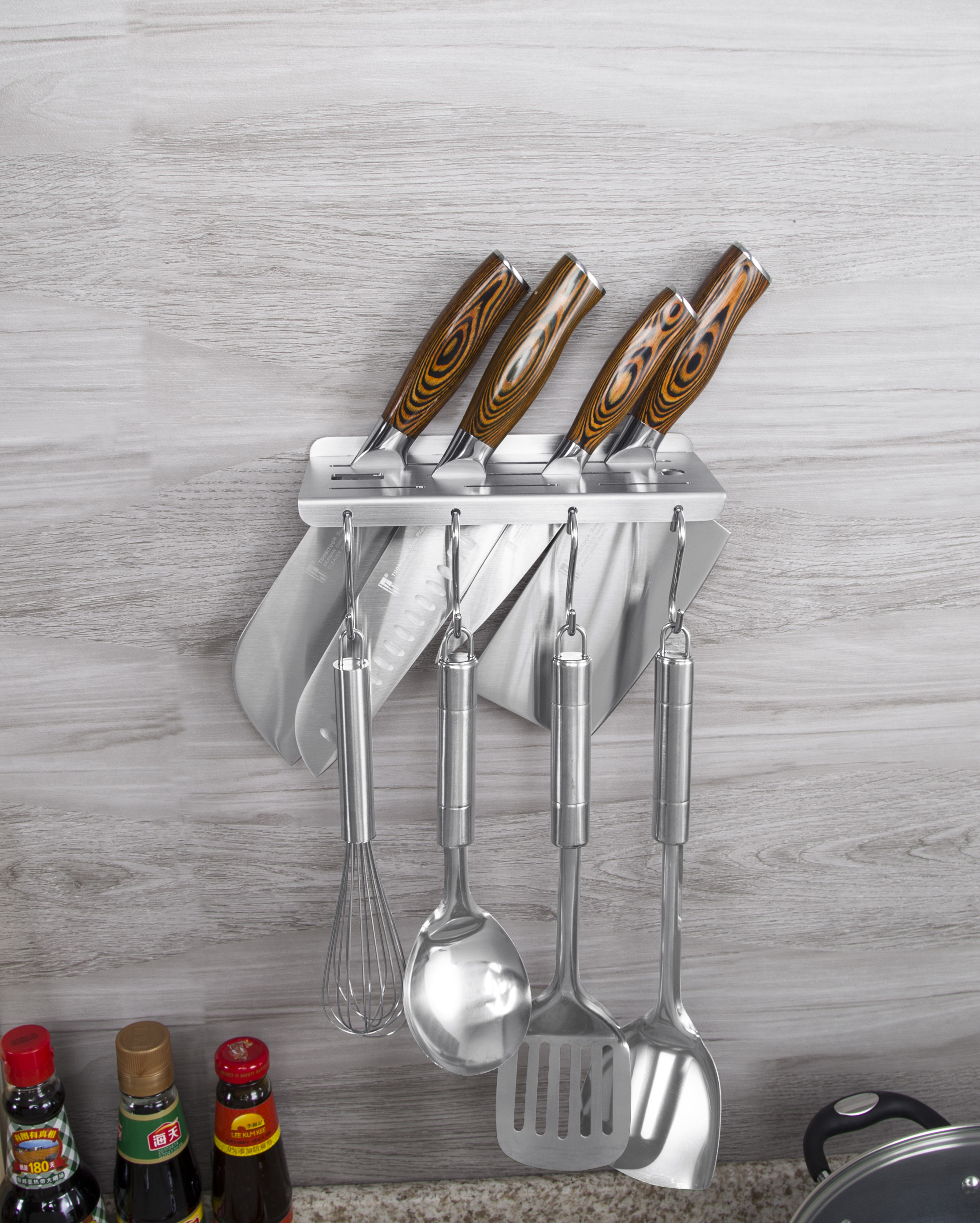 Công năng: treo dao kéo, mài dao, dao bào, móc treo muỗng vá