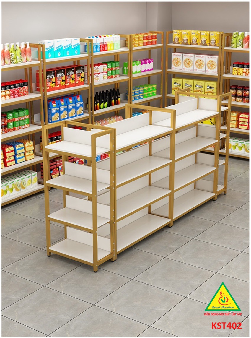 • Kệ đôi hay kệ bán hàng siêu thị có hai mặt trưng bày sản phẩm. Có thể lắp đặt kệ độc lập giữa không gian hoặc nối tiếp thành một dãy kệ dài để trưng bày sản phẩm. Với thiết kế như vậy, kệ thường được đặt tại giữa mặt bằng, vừa trưng bày sản phẩm, vừa phân chia quầy hàng, tạo thành lối đi cho khách hàng.