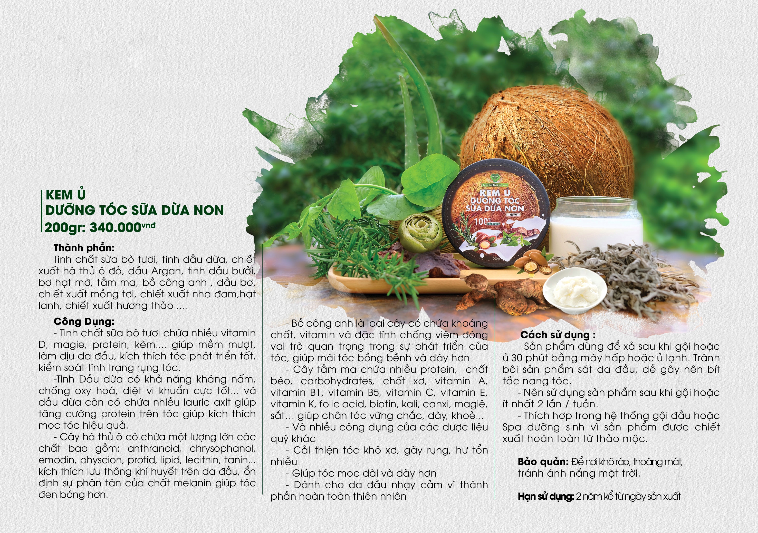 - Sản phẩm dùng để xả sau khi gội hoặc ủ 30 phút bằng máy hấp hoặc ủ lạnh . Tránh bôi sản phẩm sát da đầu , gây nên bít tắc nang tóc . Nên sử dụng sản phẩm sau khi gội hoặc ít nhất 2 lần / tuần . Thích hợp trong hệ thống gội đầu hoặc Spa dưỡng sinh vì sản phẩm được chiết xuất hoàn toàn từ thảo mộc . Bảo quản : Để khô ráo , thoáng mát , tránh ánh nắng mặt trời . Hạn sử dụng : 2 Năm kể từ ngày sản xuất