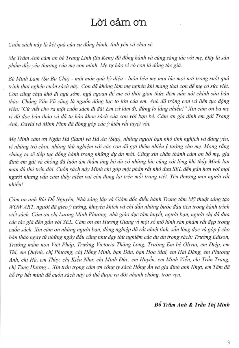 Bé Minh Lam (Su Bu Cha) - một món quà kỳ diêu - luôn bên mẹ mọi lúc mọi nơi trong suốt qúa trình thai nghén cuốn sách này. Con đã không làm mẹ nghén khi mang thai con để mẹ có sức viết. Con cũng chịu khó đi ngủ sớm, ngủ ngoan để mẹ có thời gian thức đêm nắn nót chỉnh sửa bản thảo. Chồng Vân Vũ cũng là nguồn động lực to lớn của em. Anh đã trông con và liên tục động viên: "Cứ viết cho ra một cuốn sách đi đã! Em cứ làm đi, đừng lo lắng nhiều". Xin cảm ơn ba mẹ vì đã đọc bản thảo và đã tự hào khoe sách của con với bạn bè. Cảm ơn gia đình em gái Trang Anh, David và Minh Finn đã đóng góp ý kiến rất tuyệt vời.