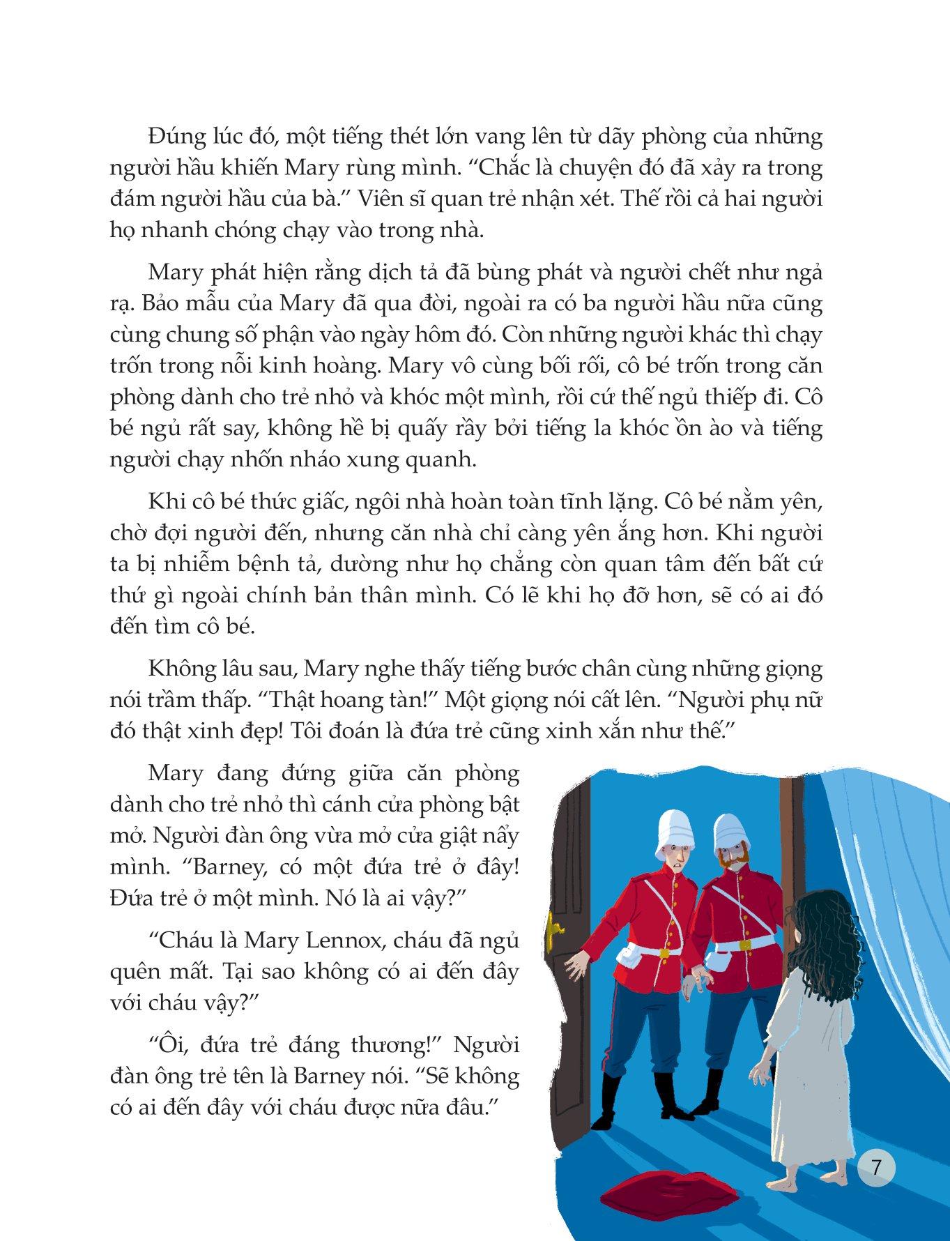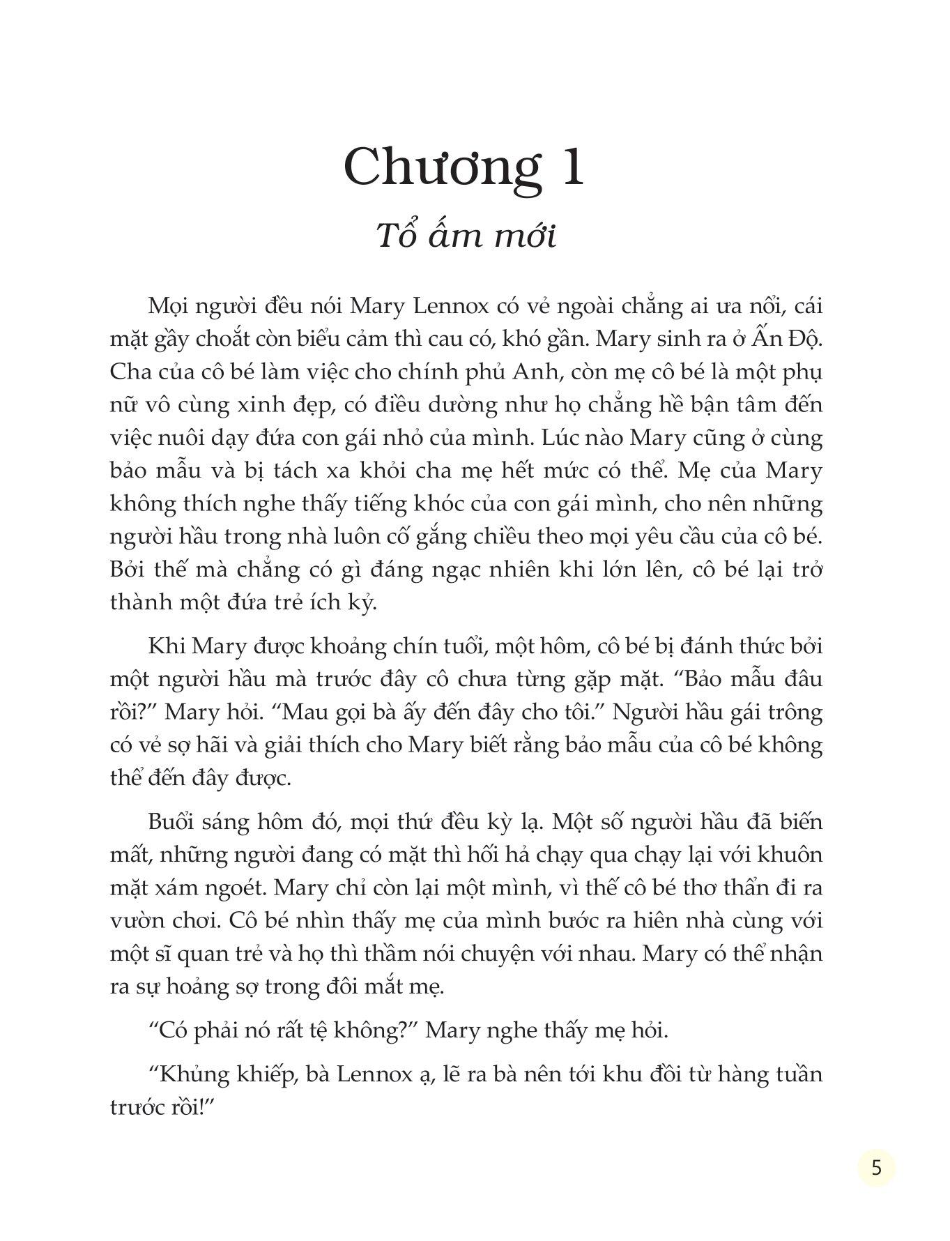 Mọi người đều nói Mary Lennox có vẻ ngoài chẳng ai ưa nổi, cái mặt gầy choắt còn biểu cảm thì cau có, khó gần. Mary sinh ra ở Ấn Độ. Cha của cô bé làm việc cho chính phủ Anh, còn mẹ cô bé là một phụ nữ vô cùng xinh đẹp, có điều dường như họ chẳng hề bận tâm đến việc nuôi dạy đứa con gái nhỏ của m.ình. Lúc nào Mary cũng ở cùng bảo mẫu và bị tách xa khỏi cha mẹ hết mức có thể. Mẹ của Mary không thích nghe thấy tiếng khóc của con gái m.ình, cho nên những người hầu trong nhà luôn cố gắng chiều theo mọi yêu cầu của cô bé. Bởi thế mà chẳng có gì đáng ngạc nhiên khi lớn lên, cô bé lại trở thành một đứa trẻ ích kỷ.