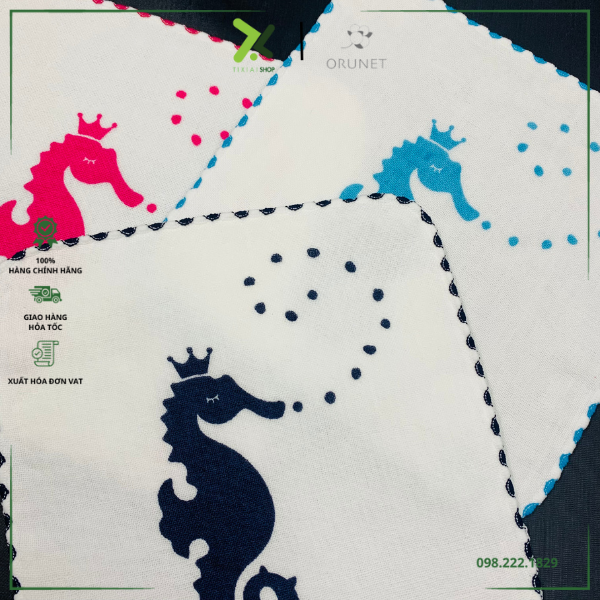 Họa tiết là hình con cá ngựa xinh xắn với bề mặt với họa tiết là gạc và mặt sau là vải cọc nên chiếc khăn này tuy mỏng nhưng có khả năng thấm hút cao.
