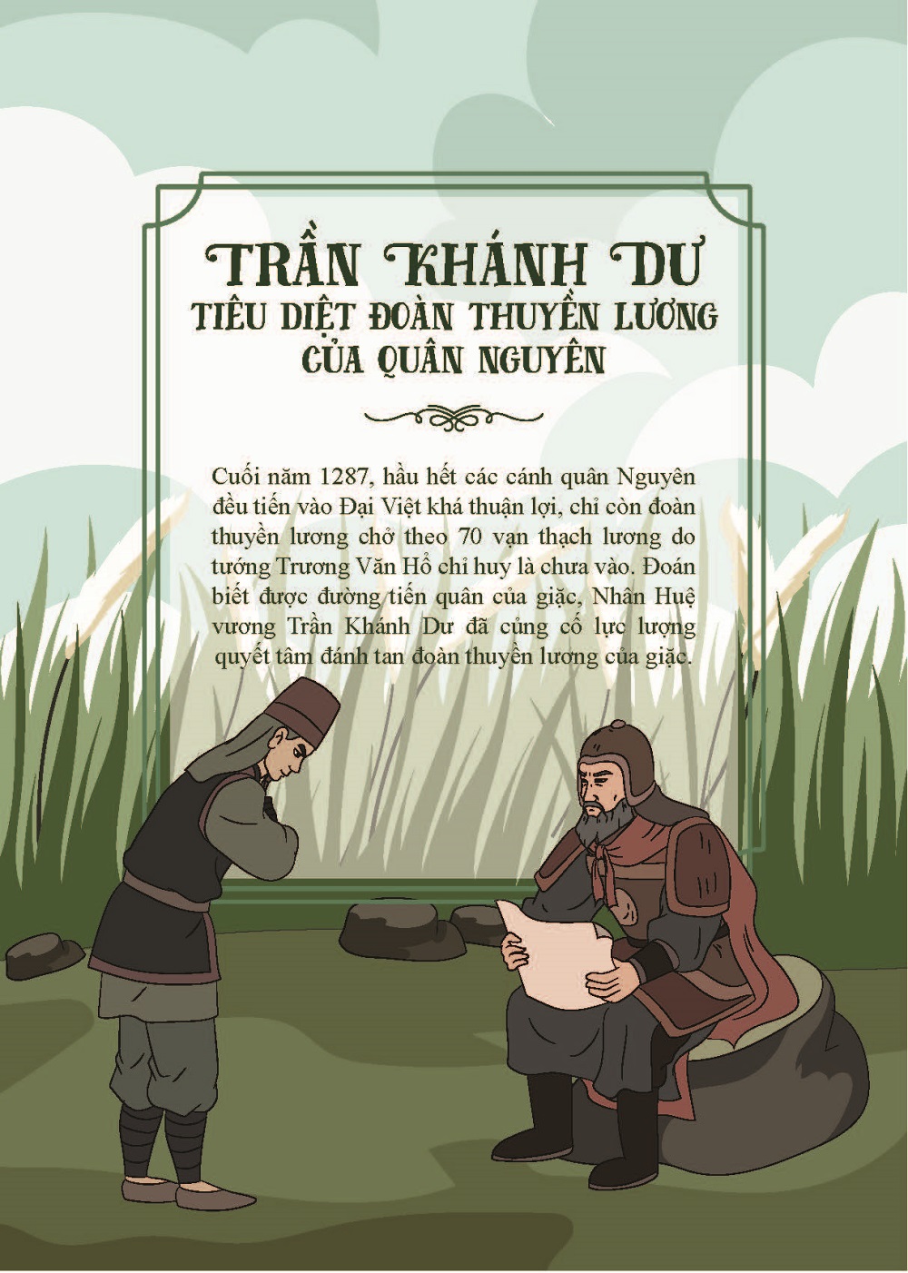 Mua tại TiktokBộ sách “Truyện tranh lịch sử Việt Nam – Khát vọng non sông” gồm hàng trăm tập, giới thiệu ngắn gọn, sinh động những truyền thuyết đầy tính nhân văn và những sự kiện, những nhân vật nổi tiếng trong lịch sử hàng nghìn năm của dân tộc Việt Nam. Trần Khánh Dư tiêu diệt đoàn thuyền lương của quân Nguyên – Đoán biết được đường tiến quân của giặc Nguyên, Nhân Huệ vương Trần Khánh Dư đã củng cố lực lượng quyết tâm đánh tan đoàn thuyền lương của tướng giặc Trương Văn Hổ, làm thất bại kế hoạch tiếp tế lương thực của quân Nguyên, tạo điều kiện cho quân Đại Việt nhanh chóng chuyển sang thế phản công chiến lược.