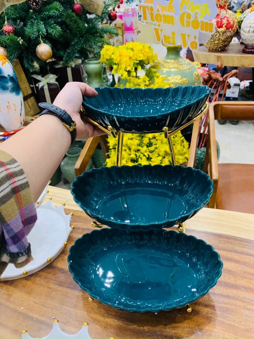 Khay đựng hoa quả, bánh kẹo, mứt Tết 2 tầng, 3 tầng bằng gốm sứ kèm đế kim loại mạ vàng cao cấp.