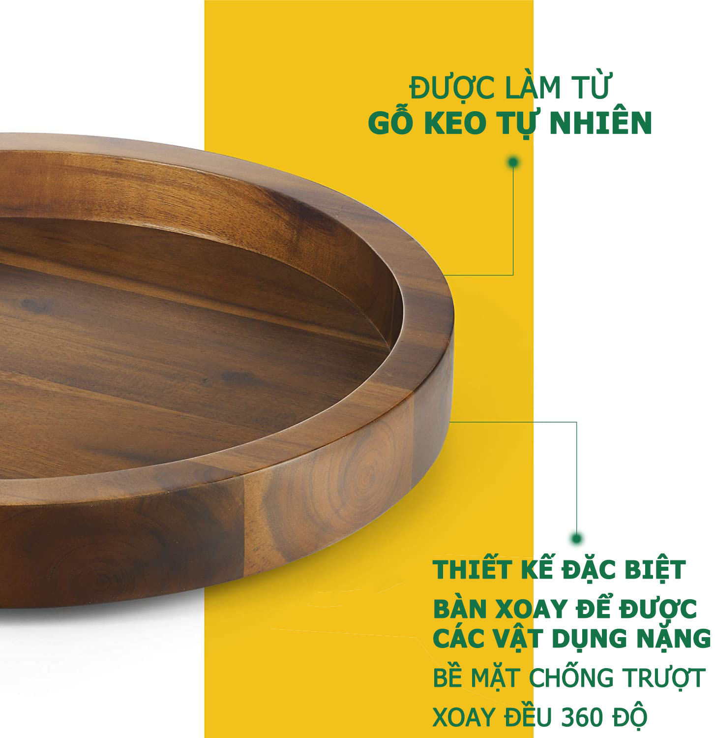 Khay gỗ xoay 360 độ đường kính 33cm, decor trang trí thức ăn, đựng đồ dùng nhà bếp, là sản phẩm xuất khẩu sang USA, được sản xuất tại Việt Nam với những ưu điểm vượt trội: