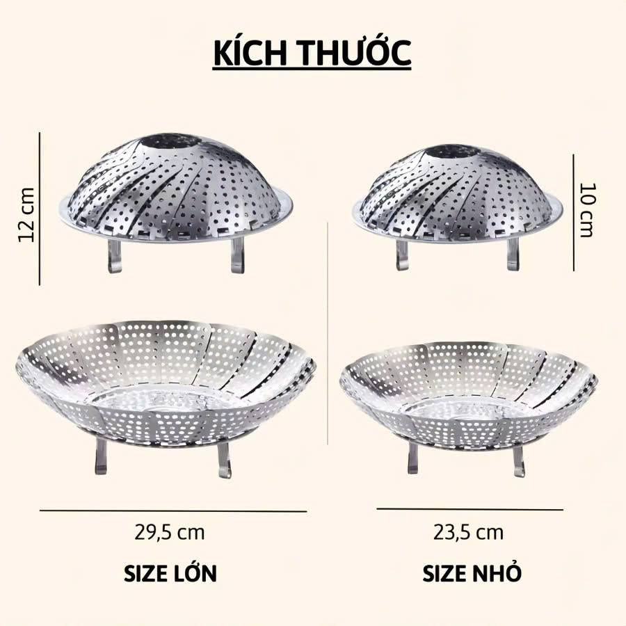 Sản phẩm xửng hấp inox có thể mở ra hết cỡ và thu lại gọn gàng khi không cần sử dụng.