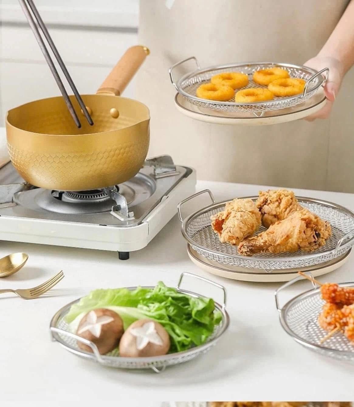 Ráo dầu nhanh – Giữ món chiên giòn ngon, sạch dầu Dùng được trong Nồi Chiên Không Dầu – Giữ sạch lòng nồi, dễ vệ sinh Chuyển đổi thành xửng hấp – Hấp nóng, thơm