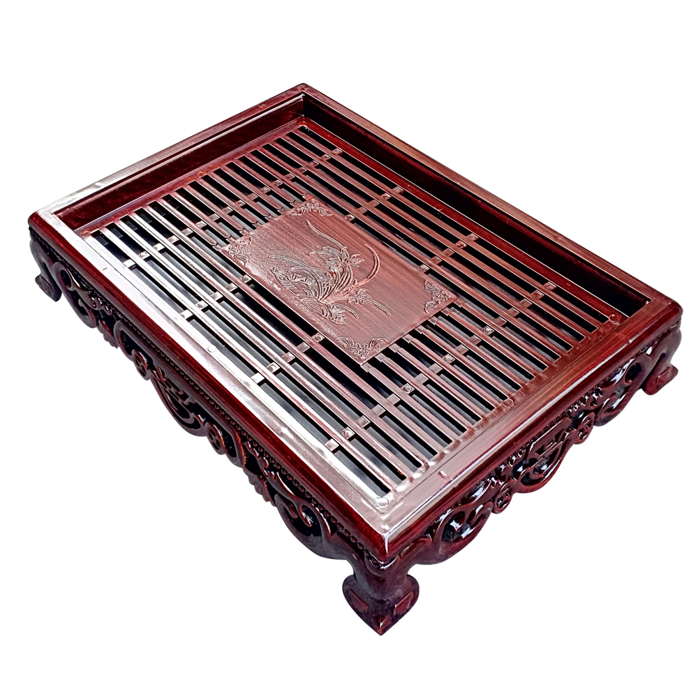Khay chén siêu đẹp siêu nét Kích thước: dài 43cm rộng 28, cao 5cm Có khay nhựa đựng nước thừa Khay gỗ đã qua xử lý nên dù có đổ nước vào Lại càng đẹp