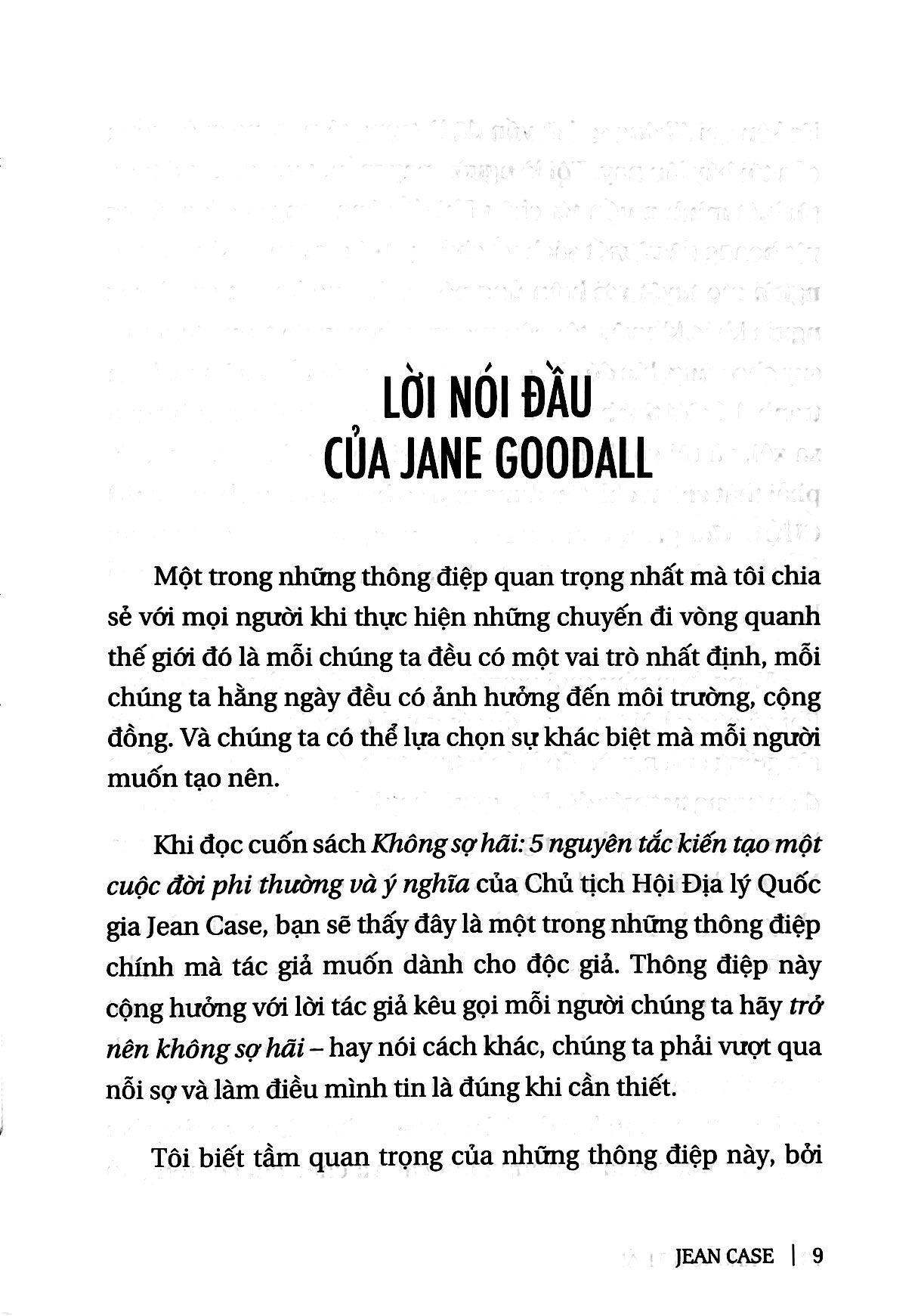 Không sợ hãi là lời kêu gọi hành động cho những người muốn tìm kiếm, xây dựng một cuộc sống phi thường và mang đến sự thay đổi lớn lao. Khi Chủ tịch Hội Địa lý quốc gia Mỹ Jean Case quyết định nghiên cứu các giá trị cốt lõi của những nhà kiến tạo vĩ đại, trong quá khứ cũng như hiện tại, từ những nhà sáng chế đến những nhà cách mạng, bà tìm thấy 5 đặc điểm chung đáng ngạc nhiên. Họ không phải là những giàu có, có đặc quyền hay thậm chí là không phải là thiên tài, mà họ là những người khác biệt dám “cược lớn”, can đảm chấp nhận mạo hiểm, biến thất bại thành những bài học ý nghĩa, không ngại vươn xa và để cho sự cấp bách chinh phục nỗi sợ hãi.  Trong cuốn sách Không sợ hãi, Jean Case khắc họa rõ nét 5 nguyên tắc này thông qua nhiều câu chuyện sống động – từ kinh nghiệm chuyển đổi của cá nhân bà, tới câu chuyện ấn tượng của Jane Goodall Tiến sĩ, Hiệp sĩ Hoàng gia Anh trong việc thấu hiểu và bảo vệ loài tinh tinh, quyết định của đầu bếp nổi tiếng José André trên con đường trở thành “người phản ứng đầu tiên” và đưa nhà bếp của anh đến những nơi bị bão tàn phá để chăm sóc những người bị đói, cho tới nỗ lực đầy tham vọng của Bryan Stevenson – luật sư, nhà hoạt động xã hội – nhằm chấm dứt tình trạng bất bình đẳng, và nhiều câu chuyện khác nữa…. Bà chia sẻ các góc nhìn mới mẻ sâu sắc cùng những câu chuyện mà có thể bạn đọc từng biết tới – như câu chuyện của AirBnB khởi đầu từ con số không trở thành ngành công nghiệp khách sạn, hay quyết định chinh phục Mặt trăng của nhân vật làm nên lịch sử - Tổng thống John F. Kennedy, và nhiều viên ngọc quý từ những người kiến tạo sự thay đổi mà bạn chưa từng nghe nói.  Bằng cách kết hợp các câu chuyện, những lời khuyên thực tế và truyền cảm hứng, Không sợ hãi chỉ cho bạn đọc cách áp dụng thành công 5 nguyên tắc không sợ hãi vào đời sống, từ đó châm ngòi cho những ý tưởng đột phá góp phần thay đổi thế giới chúng ta đang sống theo cách tốt đẹp hơn: Dám cược lớn. Có rất nhiều người, nhiều tổ chức có tính cẩn trọng tự nhiên. Họ thường xem cách nào đã có tác dụng trong quá khứ rồi cố gắng lặp lại cách làm đó, nhưng chỉ dẫn tới sự gia tăng về lượng. Mọi biến đổi làm nên lịch sử thật sự chỉ xảy ra khi người ta quyết định thực hiện những thay đổi có tính cách mạng. Can đảm chấp nhận mạo hiểm. Hãy dám thử những điều mới mẻ, chưa ai từng trải qua và tiếp tục thử nghiệm. Chấp nhận mạo hiểm không giống như nhắm mắt lại để nhảy qua vực sâu mà là một quá trình dài để thử và sai. Biến thất bại thành những bài học ý nghĩa. Những thành tựu gia vĩ đại coi thất bại là phần cần thiết của cuộc hành trình đi tới thành công. Người ta không tìm kiếm thất bại, nhưng khi thất bại xảy ra, những nhà đổi mới vĩ đại sẽ tìm kiếm ý nghĩa đằng sau cú vấp ngã đó, phát huy bài học họ rút ra được và chia sẻ kinh nghiệm cùng người khác. Vượt khỏi vùng an toàn. Xã hội chúng ta luôn chìm đắm trong những huyền thoại về các thiên tài đơn độc. Nhưng sự đổi mới xảy ra nhờ có sự giao lưu. Việc xây dựng các mối quan hệ tốt đẹp với mọi người xung quanh, nhất là những người có kinh nghiệm đa dạng sẽ tạo nên những sự vươn xa đầy bất ngờ cho chính người trong cuộc. Để sự cấp bách chinh phục nỗi sợ hãi. Đừng nghĩ quá nhiều mà cũng đừng phân tích quá độ. Mong muốn tìm hiểu một vấn đề từ mọi góc độ là hết sức tự nhiên, nhưng tìm hiểu quá mức có thể khiến cho nỗi sợ làm bạn tê liệt. Hãy để cho nhu cầu khẩn thiết xử lý mọi hoài nghi và tư tưởng thoái lui. Điều đơn giản bạn cần nghĩ đến là hãy làm thôi. Năm nguyên tắc này có thể được tóm gọn trong cụm từ: Không sợ hãi. Khi tập hợp cùng nhau, năm nguyên tắc này sẽ tạo thành một lộ trình kiến tạo thay đổi cho mọi người, từ mọi lĩnh vực trong cuộc sống, nhưng có một điều quan trọng bạn cần nhớ, rằng đây không phải là “quy luật”. Hãy nghĩ những nguyên tắc này là một bộ tiêu chuẩn có thể giúp chúng ta nhận biết khi nào thì những quyết định được hình thành trên tinh thần không sợ hãi.