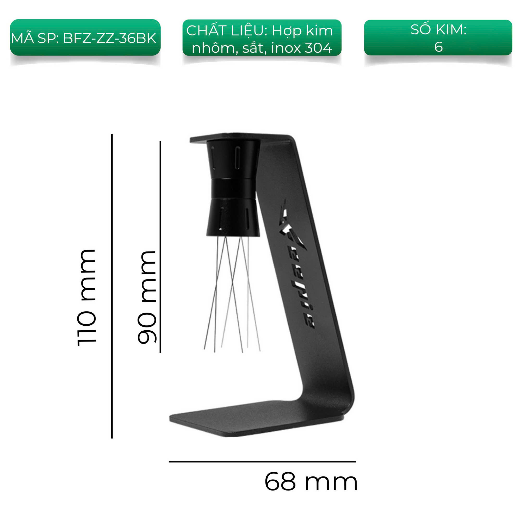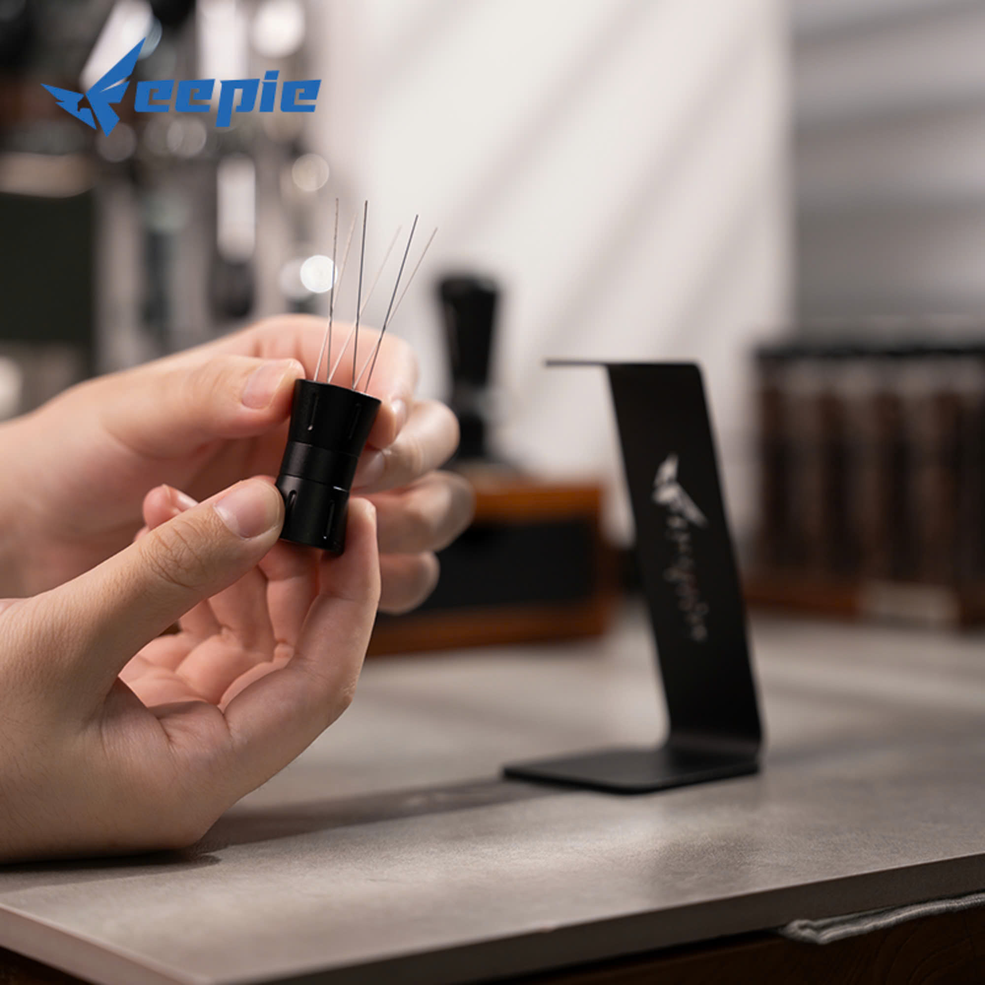 Sản phẩm được thiết kế dạng núm vặn bằng hợp kim nhôm sơn nhám. Cảm giác cầm rất chắc chắn và vừa tay. 8 thanh kim loại mỏng có độ dẻo và có thể uốn cong len lõi đánh tơi đến mọi nơi bên trong bánh cà phê. Khi bột được đánh tơi sẽ giúp phần tamping tốt hơn rất nhiều, áp suất nước sẽ chiết xuất đều hơn.