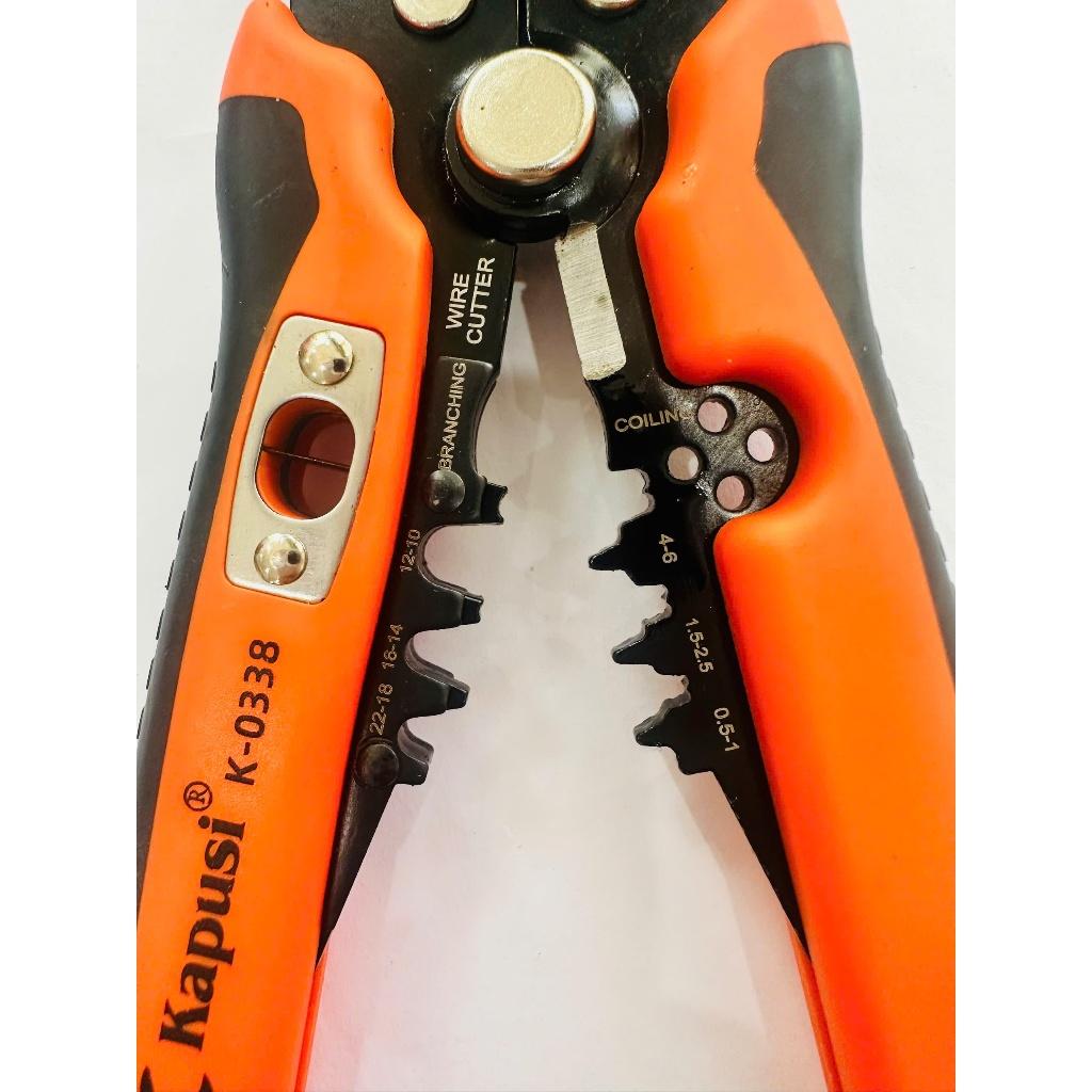 Kìm tuốt dây đa năng Kapusi K-0338 là công cụ chuyên dụng giúp tuốt vỏ dây điện, cắt dây và bấm cos nhanh chóng, chính xác.