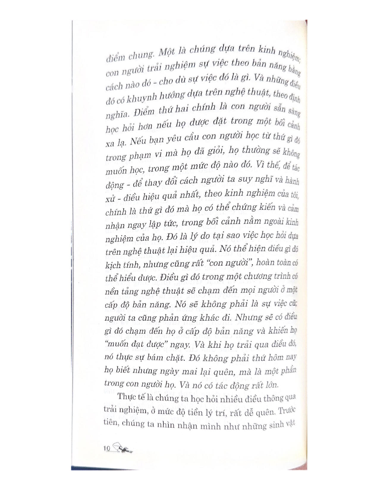 Kinh Doanh Như Trình Diễn Nghệ Thuật, Lãnh Đạo Như Đạo Diễn Sân Khấu là cách tiếp cận mới mẻ trong quản trị kinh doanh với châm ngôn: các tổ chức và các nhà lãnh đạo có thể học hỏi từ nghệ thuật. Mượn hình ảnh các nghệ sĩ biểu diễn các loại hình nghệ thuật khác nhau, tác giả nhấn mạnh một yếu tố không thể thiếu trong quản trị - kỹ thuật truyền cảm hứng, lấy con người làm trung tâm. Ngày nay, thành thạo kỹ thuật và nắm vững chuyên môn thôi chưa đủ để gặt hái được thành công như mong đợi, trong nghệ thuật lẫn trong kinh doanh. Chính vì lý do đó, nếu kinh doanh là một màn trình diễn thì hãy biến nó thành màn trình diễn chói sáng và để lại dấu ấn trong lòng khán giả.