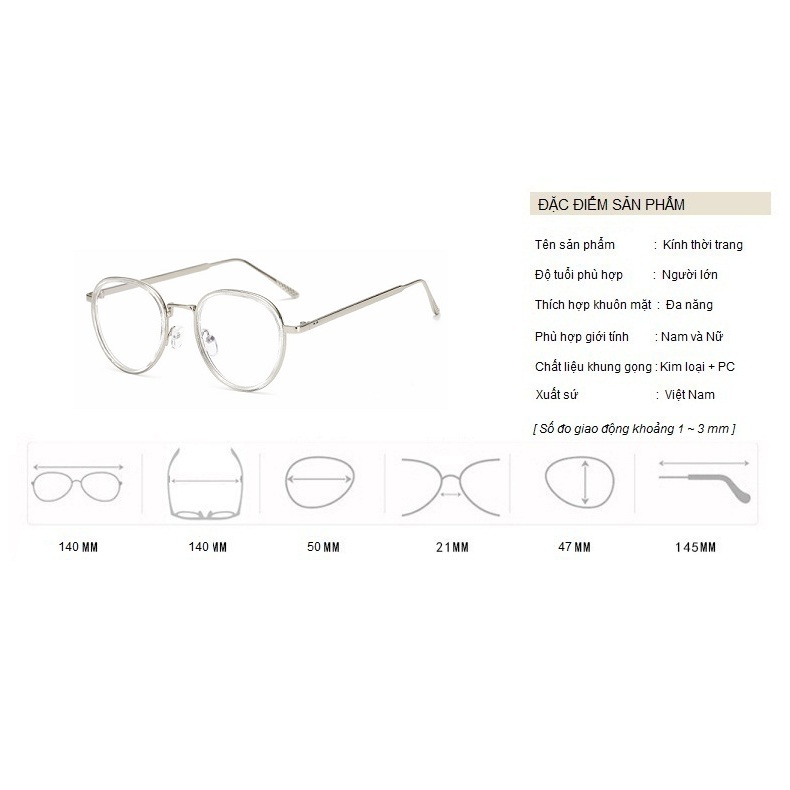 Gọng kính bằng chất liệu kim loại cao cấp, bền và tạo cảm giác thoải mái cho người sử dụng Có thể thay tròng 0 độ/cận/viễn/loạn theo nhu cầu sử dụng. Dáng Unisex phù hợp