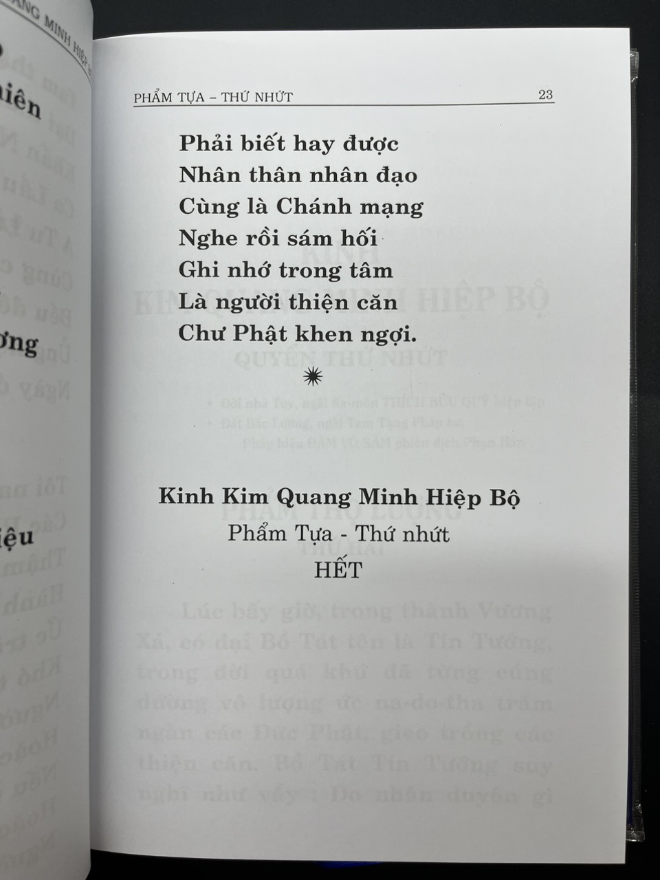 Ở đây tôi chỉ phiên dịch Kim Quang Minh Hiệp bộ. Khi bộ kinh này được dịch xong, Sư trưởng chúng tôi nhờ các vị xuất gia , Cư sĩ hữu tâm góp phần công đức với Sư trưởng chúng tôi cùng duyệt lại, để giúp cho bộ Kinh văn-lý được hoàn hảo, cú nghĩa được đúng pháp, hầu tránh khỏi những lỗi lầm còn sơ sót trong việc ấn hành.