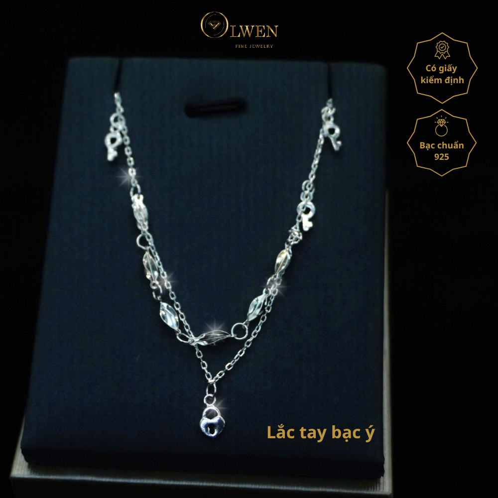 Đặc điểm: Đây là một chiếc lắc chân bạc Ý với thiết kế dạng chuỗi kép hoặc chuỗi hạt bi. Điểm nổi bật là có nhiều mặt charm nhỏ rủ xuống, có vẻ là hình chiếc lá nhỏ được làm từ bạc trơn bóng. Các charm lá được phân bố đều trên chuỗi, tạo hiệu ứng chuyển động và vẻ đẹp thanh lịch. Có một mặt charm lớn hơn được gắn ở phía dưới, có vẻ là hình một ổ khóa nhỏ hoặc một vật trang trí hình giọt nước, tạo điểm nhấn cho tổng thể thiết kế.