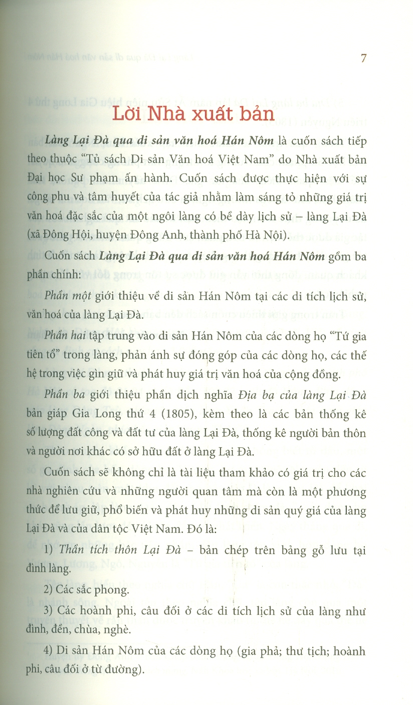 Cuốn sách Làng Lại Đà qua di sản văn hoá Hán Nôm gồm ba phần chính:  Phần một giới thiệu về di sản Hán Nôm tại các di tích lịch sử, văn hoá của làng Lại Đà.  Phần hai tập trung vào di sản Hán Nôm của các dòng họ “Tứ gia tiên tổ” trong làng, phản ánh sự đóng góp của các dòng họ, các thế hệ trong việc gìn giữ và phát huy giá trị văn hoá của cộng đồng.  Phần ba giới thiệu phần dịch nghĩa Địa bạ của làng Lại Đà bản giáp Gia Long thứ 4 (1805), kèm theo là các bản thống kê số lượng đất công và đất tư của làng Lại Đà, thống kê người bản thôn và người nơi khác có sở hữu đất ở làng Lại Đà.  Cuốn sách sẽ không chỉ là tài liệu tham khảo có giá trị cho các nhà nghiên cứu và những người quan tâm mà còn là một phương thức để lưu giữ, phổ biến và phát huy những di sản quý giá không chỉ của làng Lại Đà mà còn là của dân tộc Việt Nam. Đó là:
