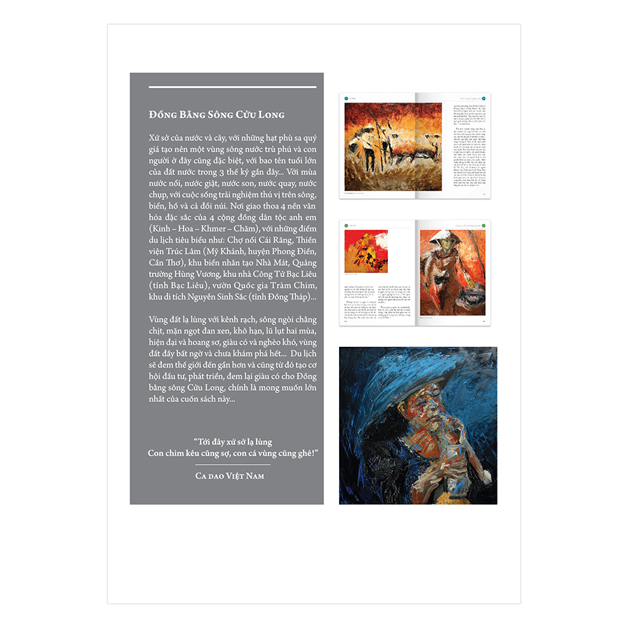 Đồng bằng sông Cửu Long – Xứ sở của nước và cây, với những hạt phù sa quý giá tạo nên một vùng sông nước trù phú và con người ở đây cũng đặc biệt, với bao tên tuổi lớn của đất nước trong 03 thế kỷ gần đây…Với mùa nước nổi, nước giật, nước son, nước quay, nước chụp,, với cuộc sống trải nghiệm thú vị trên sông, biển, hồ và cả đồi núi. Nơi giao thoa của bốn nền văn hóa đặc sắc của 04 cộng đồng dân tộc anh em (Kinh – Hoa – Khmer – Chăm)….. Vùng đất lạ lùng với kênh rạch, sông ngòi chằng chịt, mặn ngọt đan xen, khô hạn, lũ lụt hai mùa, hiện đại và hoang sơ, giàu có và nghèo khó, vùng đất đầy bất ngờ và chưa khám phá hết….Du lịch sẽ đem thế giới đến gần hơn và cũng từ đó tạo cơ hội đầu tư, phát triển, đem lại giàu có cho Đồng bằng sông Cửu Long, chính là mong muốn lớn nhất của cuốn sách này….