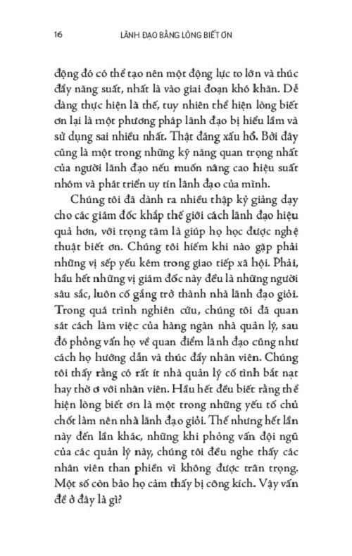 Người lao động muốn biết và cần biết công việc của mình có được trân trọng hay không. Bày tỏ lòng biết ơn đúng cách với nhân viên là phương thức đơn giản nhất, nhanh nhất, cũng như ít tốn kém nhất để tăng cường hiệu quả làm việc và giữ chân nhân viên lâu dài. Nhưng bằng cách nào, ngoài tiền thưởng và lời khen đôi khi có vẻ sao rỗng? "Lãnh Đạo Bằng Lòng Biết Ơn" sẽ gợi ý cho bạn. Quyển sách này đi sâu bàn luận một yếu tố tâm lý trong quản trị là lòng biết ơn và đưa ra những các thức đơn giản và thiết thực để phát huy yếu tố đó trong môi trường công sở hằng ngày nhằm thúc đẩy tinh thần, hiệu quả và lợi nhuận. Với giọng văn dễ hiểu, nhẹ nhàng và những ví dụ thiết thực, sau mỗi phần thực hành đều có phần tóm tắt để độc giả dễ nhớ và dễ theo dõi, quyển sách sẽ dẫn bạn qua từng phần, từ những hiểu lầm về cách thể hiện lòng biết ơn nơi công sở, đến những cách thức để áp dụng lòng biết ơn đến cách thể hiện lòng biết ơn cả trong đời sống cá nhân lẫn môi trường công sở.