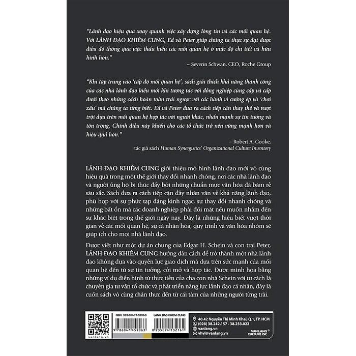 Được viết như một dự án chung của Edgar H. Schein và con trai Peter, Lãnh Đạo Khiêm Cung hướng dẫn cách để trở thành một nhà lãnh đạo không dựa vào quyền lực giao dịch mà dựa trên sức mạnh của mối quan hệ đến từ sự tin tưởng, cởi mở và hợp tác. Được minh họa bằng những ví dụ điển hình từ thực tiễn của cha con nhà Schein với tư cách là chuyên gia tư vấn tổ chức và phát triển năng lực lãnh đạo cá nhân, đây là cuốn sách vô cùng chân thực đến từ cái tâm của những người từng trải.