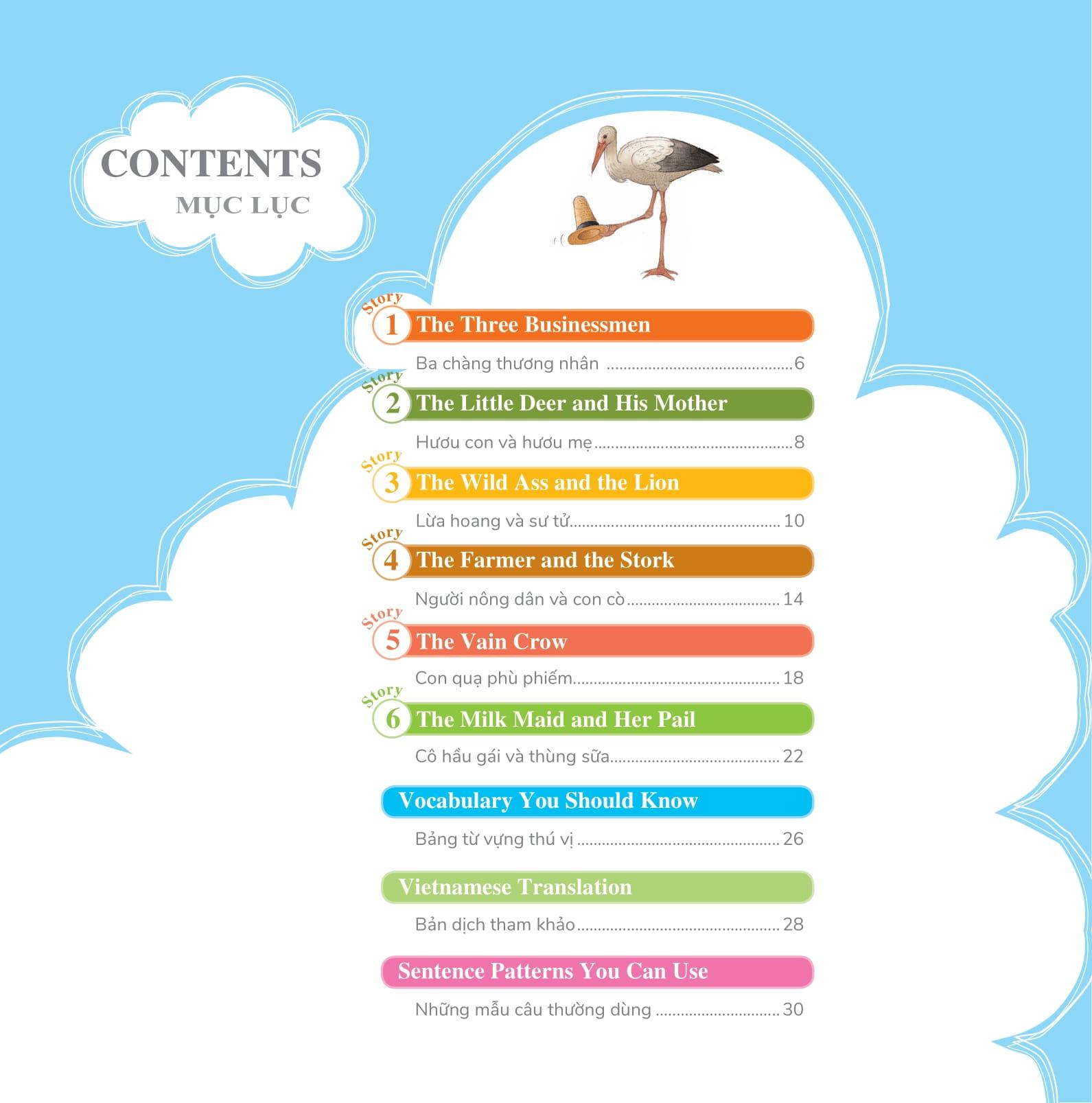 Bộ sách Học tiếng Anh qua truyện ngụ ngôn này đưa những câu chuyện dí dỏm ấy đến với các bạn nhỏ qua một diện mạo hoàn toàn khác. Các em sẽ được đọc những câu chuyện dễ hiểu bằng tiếng Anh chuẩn mực, mang đến những thông điệp giản dị mà sâu sắc, từ đó tìm hiểu từ vựng, cấu trúc ngữ pháp cũng như mẫu câu tiếng Anh xuất hiện trong sách.