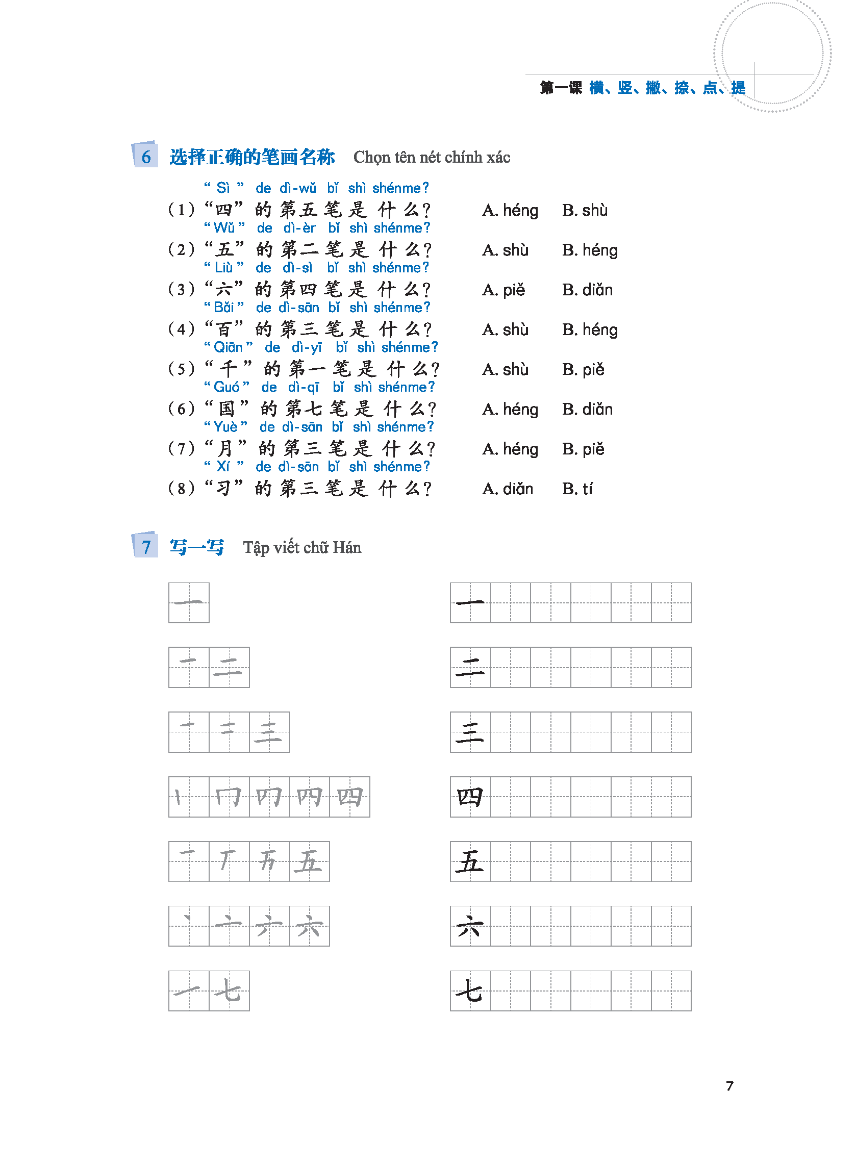 Mảng này là phần bài tập được thiết kế nhằm vào nội dung bài học. Việc thiết kế bài tập dựa theo nguyên tắc từ dễ đến khó, từ nội dung trong bài mở rộng đến ngoại khóa, từ chữ, từ (hoặc cụm từ), câu lại đến đoạn văn, từng bước dẫn dắt học sinh nắm vững nội dung bài học, đồng thời có thể dần dần hoàn thành bài tập một cách độc lập. Phần “Tập viết chữ Hán” chủ yếu để học sinh hoàn thành nhiệm vụ viết chữ trong ô vuông trên cơ sở nhận đọc chữ Hán và hiểu được nghĩa chữ, làm sâu sắc hơn sự lý giải và nắm vững về quy tắc kết cấu chữ Hán của học sinh. Nhằm vào những từ mới trọng điểm của mỗi bài, chúng tôi đã thiết kế bài tập “Chọn từ điền trống”. Mục đích chủ yếu của bài tập “Chọn câu trả lời thích hợp” là giúp người học nhận đọc câu trong ngữ cảnh. Phần “Câu đố” có độ khó nhất định, chủ yếu là để kiểm tra xem học sinh có am hiểu về cấu tạo, cách viết và các kiến thức có liên quan đến chữ Hán hay không, đáp án câu đố đều đến từ những chữ trọng điểm và những từ thường dùng xuất hiện trong bài đó. Theo sự gia tăng của lượng chữ mà người học phải học, bắt đầu từ bài 6, chúng tôi dùng những câu đơn giản cùng với từ mới xuất hiện trong bài đó để viết lại những mẩu truyện cười, mục đích là tái hiện và củng cố lại những nội dung đã học trong bài, bồi dưỡng hứng thú đọc cho học sinh.