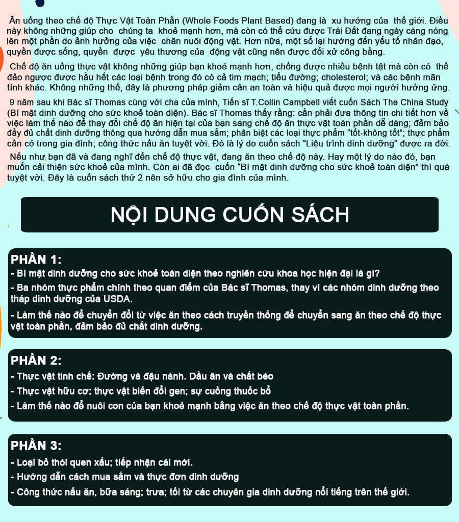 Nếu như bạn đã và đang nghĩ đến chế độ thực vật, đang ăn theo chế độ này. Hay một lý do nào đó, bạn muốn cải thiện sức khoẻ của mình. Còn ai đã đọc cuốn “Bí mật dinh dưỡng cho sức khoẻ toàn diện” thì quá tuyệt vời. Đây là cuốn sách thứ 2 nên sở hữu cho gia đình của mình.