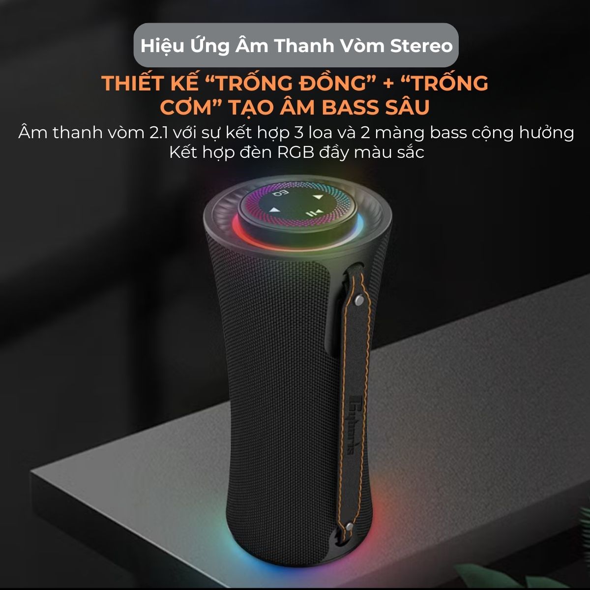 ️ Thiết kế sang trọng, kết hợp vải và ABS bền bỉ, mặt trước sử dụng lưới cao cấp, chống bám bụi. ️ Tích hợp đèn RGB nổi bật, tăng tính thẩm mỹ và sự sôi động khi nghe nhạc. ️ Trang bị công suất tổng 80W với hệ thống 2.1, gồm 1 loa bass 50W (66mm) kèm 2 loa treble 15W, tạo hiệu ứng âm thanh vòm lan tỏa. ️ Dung lượng pin lớn 8.000mAh, nghe nhạc lên đến 15 giờ, hỗ trợ cổng USB bổ cấp điện. ️ Kết nối không dây TWS giúp ghép đôi 2 loa, nhân đôi công suất lên 160W, tạo trải nghiệm âm thanh đồng bộ. ️ Hỗ trợ nhiều chế độ phát nhạc: Bluetooth, TF card, USB flash, cáp AUX. ️ Khả năng chống nước IPX5, thoải mái dùng ngoài trời mà không lo ẩm ướt.