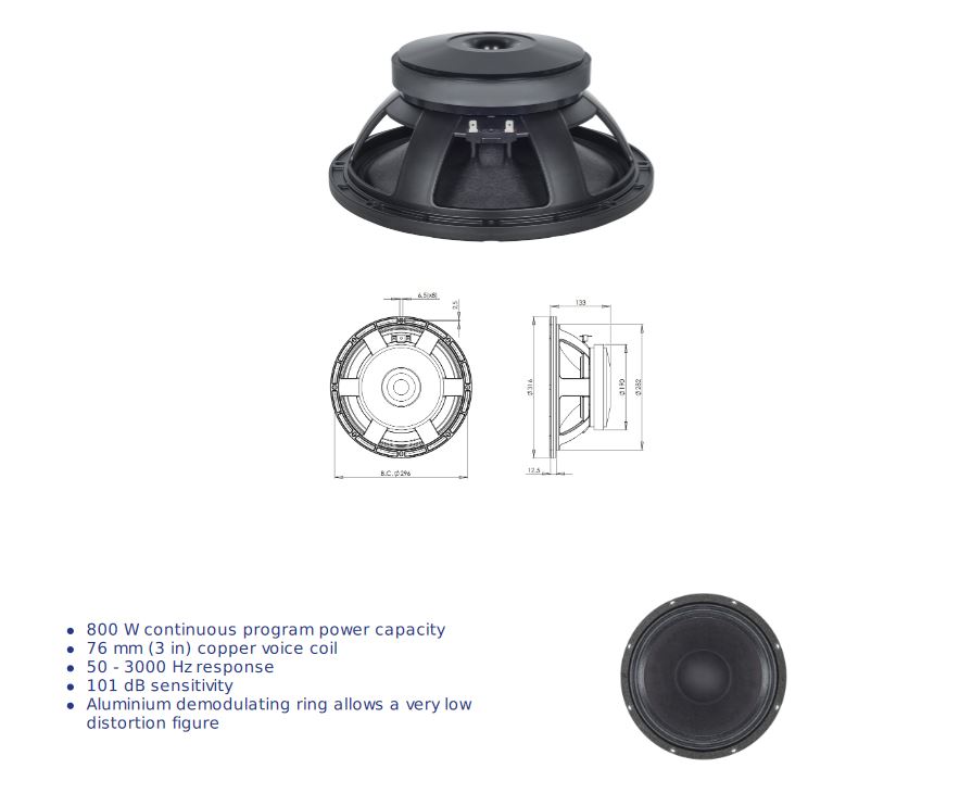 Loa bass rời 3 tấc (12 inches) B&C Speakers 12MH32 có công suất 400/800 W, coil loa bằng đồng 76 mm, tần số 50 – 3000 Hz, độ nhạy 101 dB, nam châm từ Ferrite mạnh mẽ, trở kháng 8 ohms, là lựa chọn lý tưởng cho việc lắp đặt hệ thống âm thanh sân khấu FOH, hệ thống âm thanh trực tiếp, loa monitor, karaoke và nhiều ứng dụng âm thanh khác.