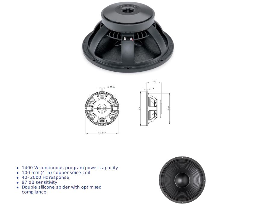 LOA RỜI 4 TẤC B&C Xuất xứ : ITALIA Voice coil bằng đồng khổ lớn 3" (76mm) với chiều cao 19mm Công Suất Program 2400 W Dải tần: 40-3000 hz Độ