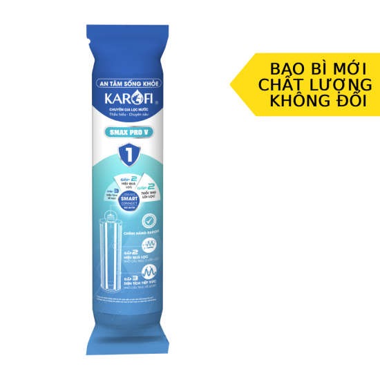 - Thời gian thay lõi khuyến nghị: 12 tháng Tổng quan về lõi Smax Pro V1 Ứng dụng những công nghệ tương lai để tạo nên hệ lõi Smax Pro V thế hệ mới, không chỉ lọc sạch vượt trội, đem đến hiệu quả gấp đôi mà còn kéo dài tuổi thọ gấp 2 lần so với thông thường. Sản phẩm độc quyền của Karofi, tích hợp thêm công nghệ Smart Connect kết nối thông minh, giúp khách hàng an tâm sử dụng, không lo về vấn đề hàng giả, hàng kém chất lượng tràn lan trên thị trường. Smax Pro V1 Điểm đặc biệt của công nghệ Smax Pro đến từ cấu tạo bởi màng lọc vi sợi liên kết đa điểm kích thước siêu nhỏ chỉ 5 micron và sắp xếp dưới dạng cấu trúc gấp rẻ quạt thông minh. X3 diện tích tiếp xúc Nhờ thiết kế tối ưu, diện tích tiếp xúc với nước tăng gấp 3 so với thông thường, giúp lọc nhanh hơn, giảm nguy cơ bị tắc lõi. X2 hiệu quả lọc Lõi lọc Smax Pro V1 giúp loại bỏ các loại cặn bã, sạn, bùn, tảo rêu, chất rắn,... với hiệu quả lọc gấp 2 lần cùng thời gian sử dụng tối đa 12 tháng - gấp đôi tuổi thọ so với lõi lọc thông thường.