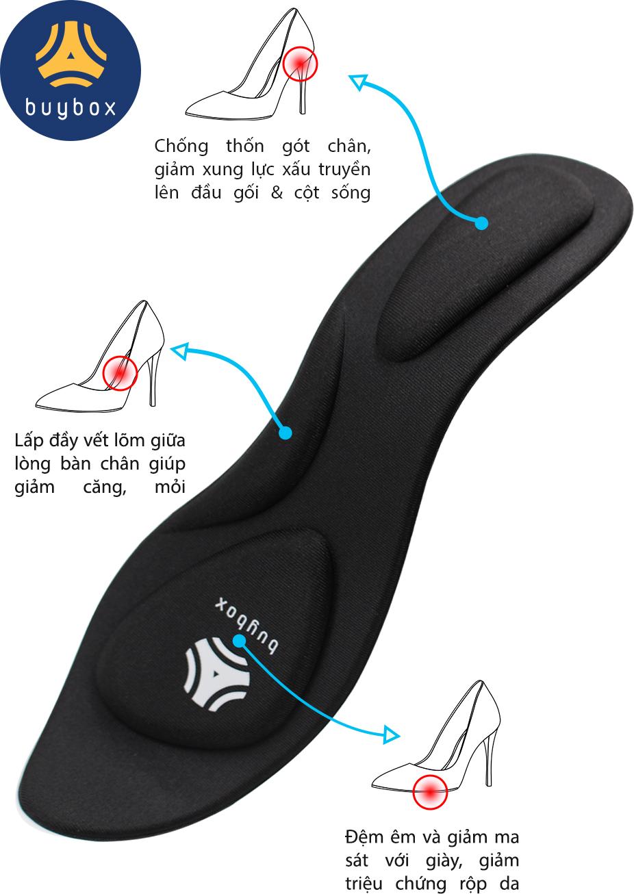 BÀN CHÂN CỦA BẠN ĐÃ ĐƯỢC BẢO VỆ ĐÚNG CÁCH CHƯA? !? Lót giày của bạn đang làm da bàn chân bị phồng rộp khi đi đứng trong thời gian lâu !? !? Lót giày lâu ngày bị xẹp lún làm cho bàn chân bị lực từ đế thô cứng tác động gây đau thốn gót chân !? !? Cấu tạo gang bàn chân nhiều phần lõm nên ngày nào cũng cảm thấy mỏi bàn chân !? !? Lót giày không thấm hút mồ hôi và giày da bí hơi khiến bàn chân luôn ướt và có mùi khó chịu !? !? Thói quen bước đi bằng gót chân gây ra các cơn đau thốn gót, đau lưng và mỏi đầu gối !? ĐÃ ĐẾN LÚC KIỂM TRA LẠI TÌNH TRẠNG MIẾNG LÓT GIÀY BẠN ĐANG MANG VÀ NGHĨ ĐẾN NHỮNG NỖI ĐAU CỦA ĐÔI BÀN CHÂN!!! SỬ DỤNG LÓT GIÀY CAO GÓT MŨI NHỌN 4D CÓ GỜ CHỐNG SỐC CỦA buybox SẼ BẢO VỆ ĐƯỢC BÀN CHÂN VÀ CẢ SỨC KHỎE CỦA BẠN!!!   CÔNG DỤNG NỔI BẬT Thiết kế 4D bảo vệ 3 điểm quan trọng của bàn chân, gồm: gót chân, gang bàn chân và lòng bàn chân phía trước mũi. Chống thốn gót chân Chống mỏi gang bàn chân Chống rộp da chân do ma sát với miếng lót chất liệu cứng và không hút mồ hôi Thấm hút mồ hôi chân giúp ngăn mùi hiệu quả Sản phẩm có thể giặt sạch bằng xà phòng nhẹ và tái sử dụng nhiều lần Giày đi lâu ngày, phần lót giày bị lún, lót vào đi êm chân hơn, thoải mái Mặt dưới miếng lót được kẻ sẵn size tương ứng. Dùng kéo cắt theo các đường cong này để có được kích thước cần sử dụng. Lót giày cao gót mũi nhọn 4D có gờ chống sốc sử dụng được cho nhiều loại giày có phần mũi nhọn như: giày sneaker, giày tây, giày mọi, giày boot, giày búp bê, giày cao gó NGỮ CẢNH SỬ DỤNG