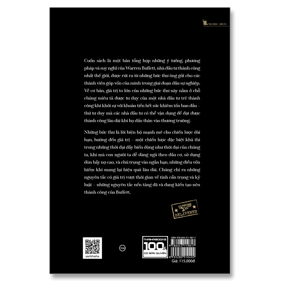 [ThaiHaBooks] Cuốn sách “Luật của Warren Buffett” là tuyển tập những lá thư cùng những nguyên tắc nền tảng trong đầu tư của Warren Buffett, một trong những nhà tỷ phú giàu nhất thế giới với khối tài sản không ngừng tăng lên từng ngày. Cuốn sách chứa đựng những kiến thức uyên thâm và tư duy của một nhà đầu tư thành công ngay cả khi bắt đầu bằng một nguồn vốn khiêm tốn. Những điều được chia sẻ trong cuốn “Luật của Warren Buffett” mang những giá trị vượt thời gian và không gian. Dù cho chàng thanh niên Buffett có khởi sự trong thời đại ngày nay, hẳn ông cũng có thể đạt được những thành quả to lớn như vậy. Mỗi chương trong cuốn sách này đều được xây dựng xung quanh một ý tưởng hoặc chủ đề riêng biệt từ những bức thư và có một bố cục đơn giản, bắt đầu là một bản tóm tắt nhằm cung cấp một số thông tin nền. Đồng thời, tất cả các trích đoạn quan trọng từ những bức thư trong từng chủ đề đều sẽ được trình bày đầy đủ. Khi mà Warren Buffett chưa từng xuất bản một cuốn giáo trình nào về đầu tư, có thể xem những bức thư được tập hợp trong cuốn sách này là một khóa học từ nhà tỷ phú thành công người Mỹ. Cuốn sách được chia làm ba phần: