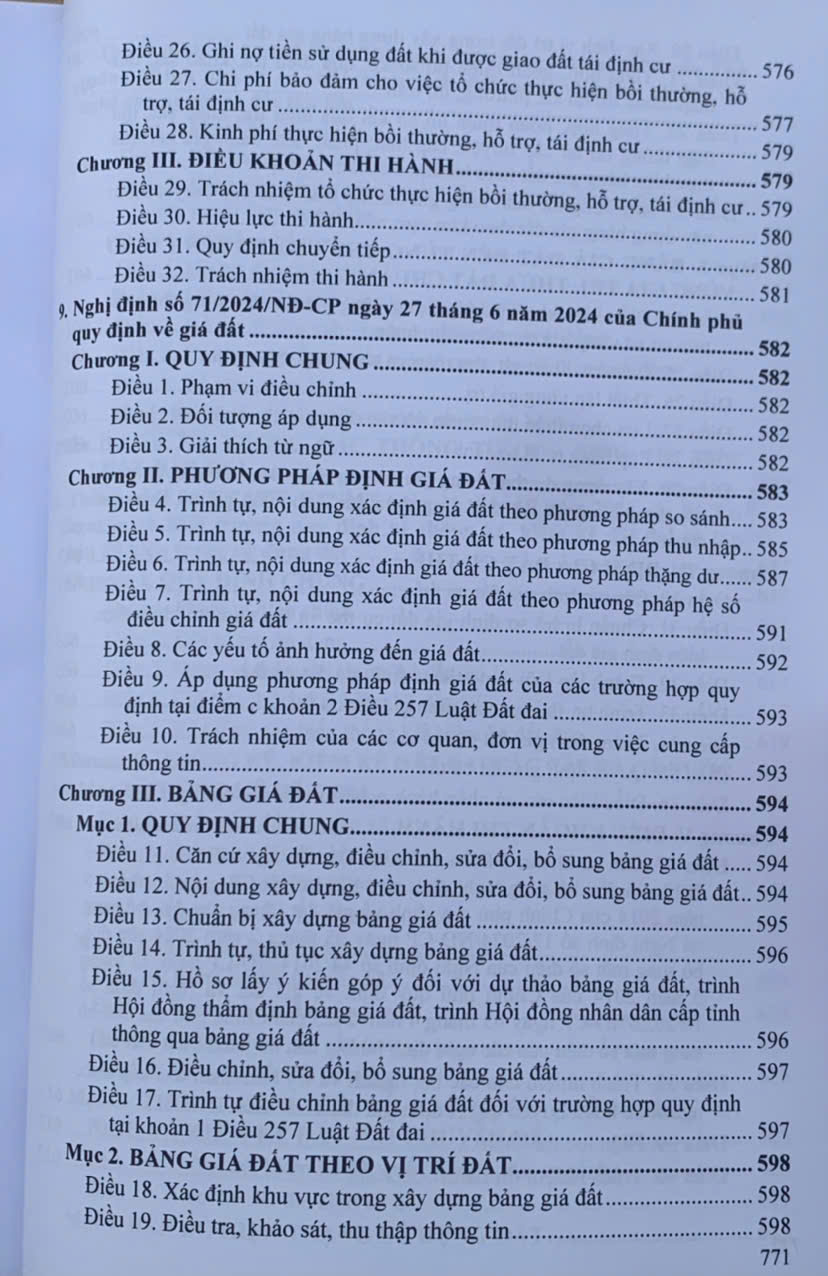 Sách- Luật Đất Đai hệ thống các văn bản quy định chi tiết thi hành Tác giả: Quốc Hội Nhà xuất bản: Hồng Đức Khổ sách: 19*27cm Năm phát hành: 10.2024 Nhà phát hành: Công ty TNHH Sách Luật Việt Nam Giá bìa: 775.000 đ Số trang: 780 trang Hình thức bìa: Bìa mềm Ngày 18 tháng 01 năm 2024, Quốc hội nước Cộng hòa xã hội chủ nghĩa Việt Nam khóa XV, kỳ họp bất thường lần thứ năm đã chính thức thông qua Luật Đất đai (sau đây gọi tắt là Luật Đất đai 2024) với nhiều điểm mới nhằm thể chế hóa toàn diện các chủ trương, chính sách của Đảng và Nhà nước. Nhằm sớm đưa Luật đất đai 2024 Chính phủ và các Bộ ngành đã ban hành nhiều văn bản quy định chi tiết thi hành như: Nghị định số 123/2024/NĐ-CP của Chính phủ: Quy định về xử phạt vi phạm hành chính trong lĩnh vực đất đai; Nghị định số 104/2024/NĐ-CP ngày 31 tháng 7 năm 2024 của Chính phủ quy định về Quỹ phát triển đất; Nghị định số 103/2024/NĐ-CP ngày 30 tháng 7 năm 2024 của Chính phủ Quy định về tiền sử dụng đất, tiền thuê đất; Nghị định số 102/2024/NĐ-CP ngày 30 tháng 7 năm 2024 của Chính phủ Quy định chi tiết thi hành một số điều của Luật Đất đai 2024; Nghị định số 101/2024/NĐ-CP ngày 29 tháng 7 năm 2024 của Chính phủ Quy định về điều tra cơ bản đất đai; đăng ký, cấp giấy chứng nhận quyền sử dụng đất, quyền sở hữu tài sản gắn liền với đất và hệ thống thông tin đất đai; Nghị định số 88/2024/NĐ-CP ngày 15 tháng 7 năm 2024 của Chính phủ Quy định về bồi thường, hỗ trợ, tái định cư khi Nhà nước thu hồi đất; Nghị định số 71/2024/NĐ-CP của Chính phủ: Quy định về giá đất: Thông tư số 08/2024/TT-BTNMT ngày 31 tháng 7 năm 2024 của Bộ Tài nguyên và Môi trường Quy định về thống kê, kiểm kê đất đai và lập bản đồ hiện trạng sử dụng đất; Thông tư số 09/2024/TT-BTNMT ngày 31 tháng 7 năm 2024 của Bộ Tài nguyên và Môi trường Quy định về nội dung, cấu trúc, kiểu thông tin cơ sở dữ liệu quốc gia về đất đai và yêu cầu kỹ thuật đối với phần mềm ứng dụng của Hệ thống thông tin quốc gia về đất đai; Thông tư số 10/2024/TT-BTNMT ngày 31 tháng 7 năm 2024 của Bộ Tài nguyên và Môi trường Quy định về hồ sơ địa chính, Giấy chứng nhận quyền sử dụng đất, quyền sở hữu tài sản gắn liền với đất; Thông tư số 11/2024/TT-BTNMT ngày 31 tháng 7 năm 2024 của Bộ Tài nguyên và Môi trường Quy định kỹ thuật điều tra, đánh giá đất đai; kỹ thuật bảo vệ, cải tạo, phục hồi đất… Để giúp quý độc giả có tài liệu tham khảo áp dụng trong công việc, Nhà xuất bản Hồng Đức xin giới thiệu cuốn sách: LUẬT ĐẤT ĐAI HỆ THỐNG CÁC VĂN BẢN QUY ĐỊNH CHI TIẾT THI HÀNH Nội dung cuốn sách bao gồm những phần như sau: Phần thứ nhất. LUẬT ĐẤT ĐAI NĂM 2024. Phần thứ hai. HỆ THỐNG CÁC NGHỊ ĐỊNH QUY ĐỊNH CHI TIẾT THI HÀNH LUẬT ĐẤT ĐAI Phần thứ ba. HỆ THỐNG CÁC THÔNG TƯ QUY ĐỊNH CHI TIẾT THI HÀNH LUẬT ĐẤT ĐAI.